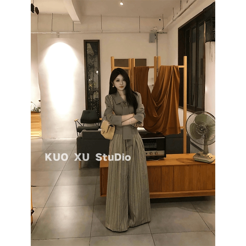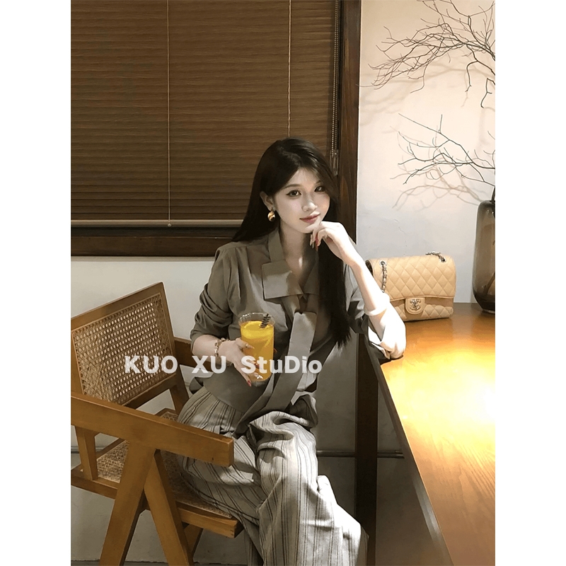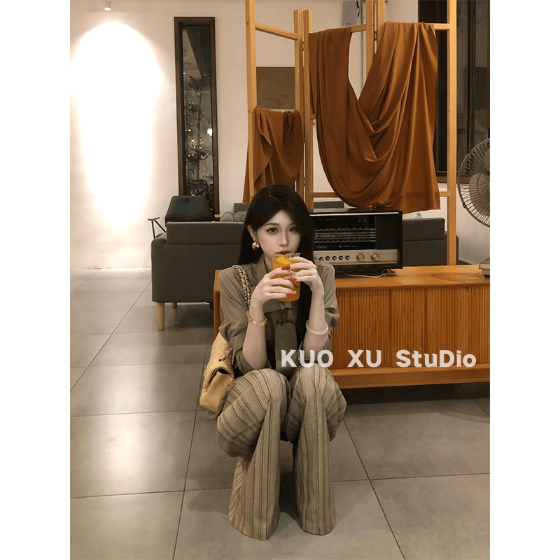 套装 直筒条纹阔腿裤 女 衬衫 早秋穿搭慵懒韩系百搭系带气质显瘦长袖