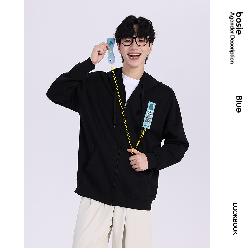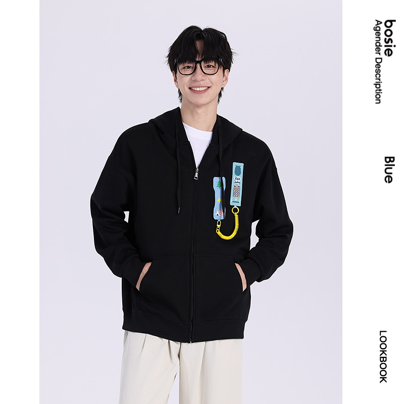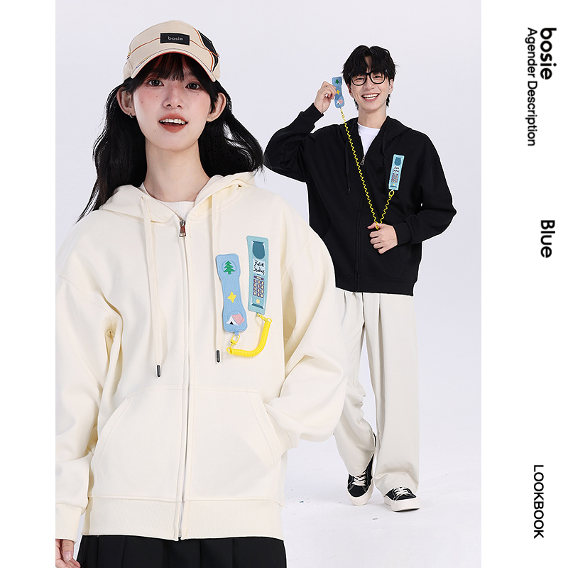 bosie伯喜2025年秋季 趣味电话开襟连帽卫衣男情侣休闲外套潮 新款