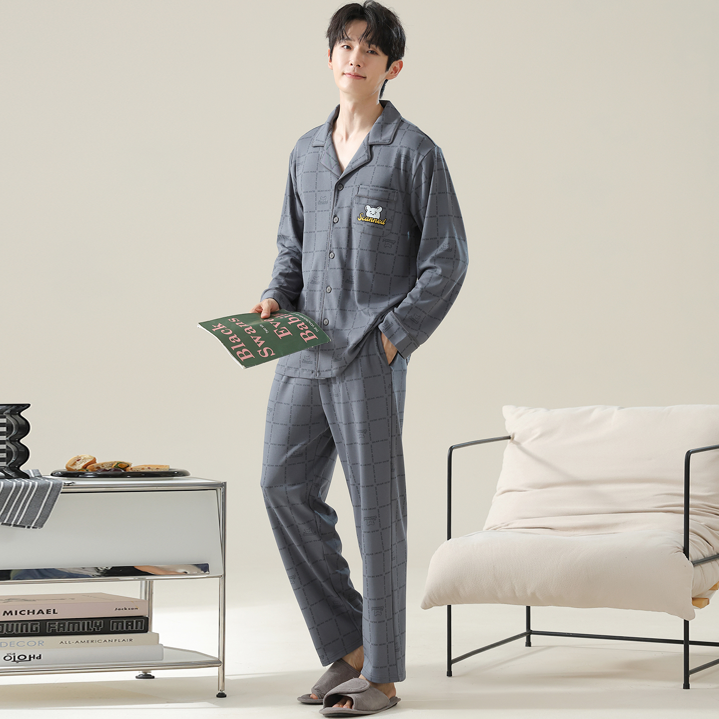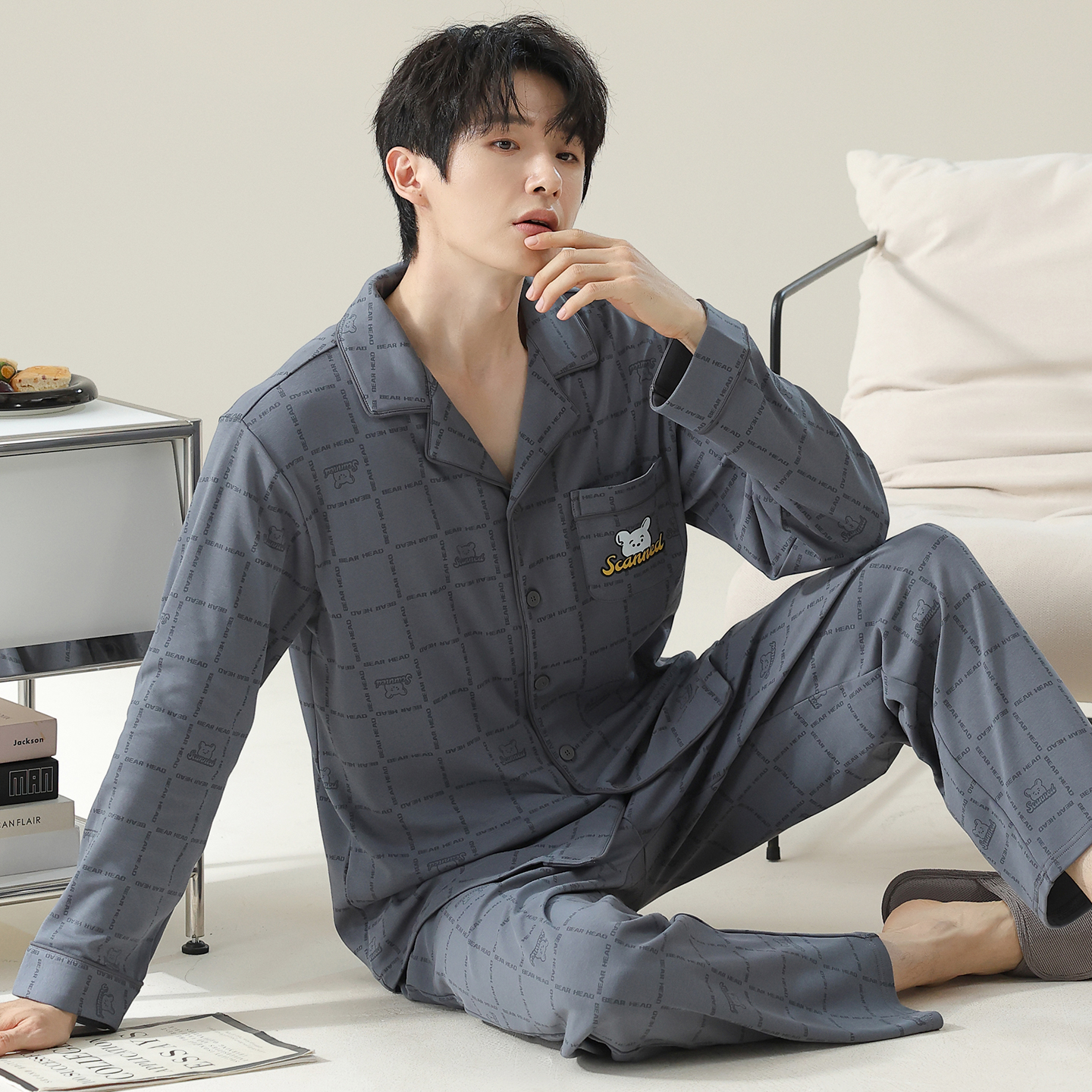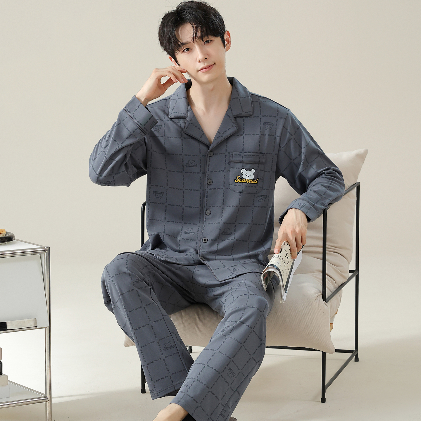 翻领家居服套装 宜而爽男士 可外穿开衫 纯棉字母格子长袖 睡衣春秋款