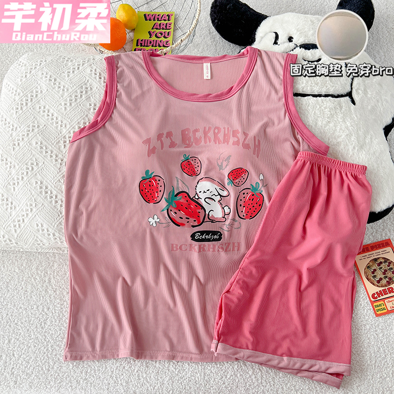 套装 猫人纯棉睡衣女带胸垫夏季 短裤 短袖 卡通甜美可外穿家居服 薄款