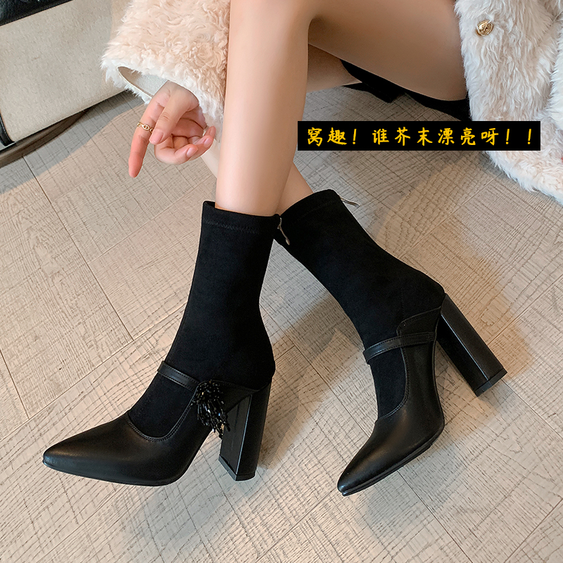 粗跟尖头高跟短靴女2025秋冬季 拼接真皮气质玛丽珍瘦腿弹力靴 新款