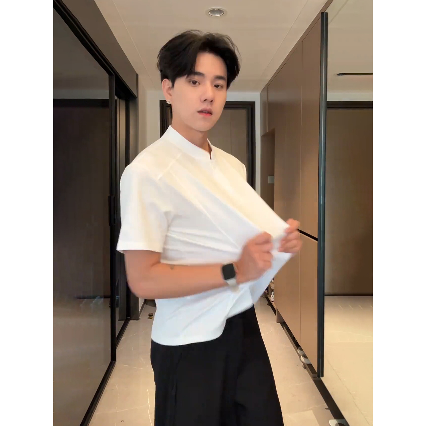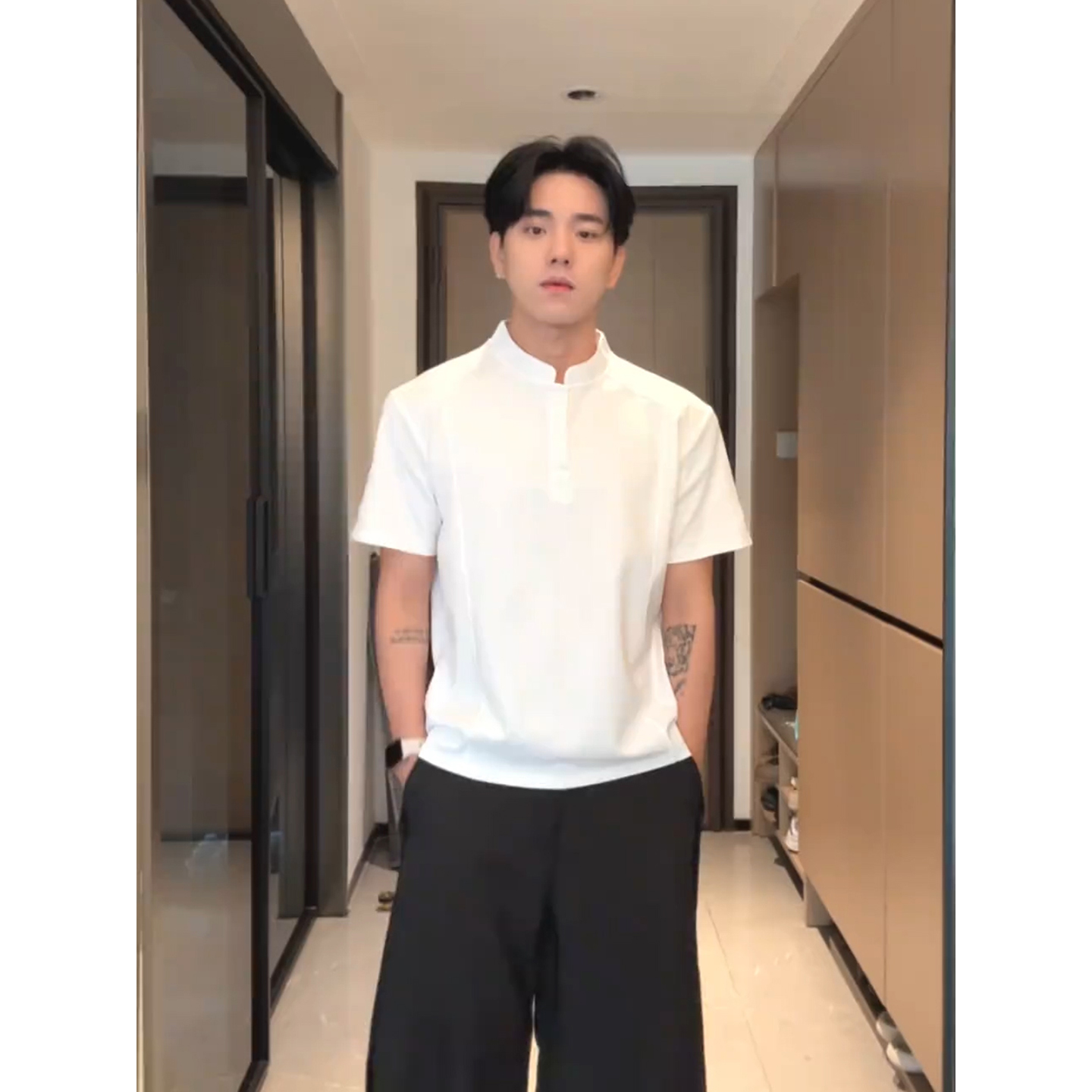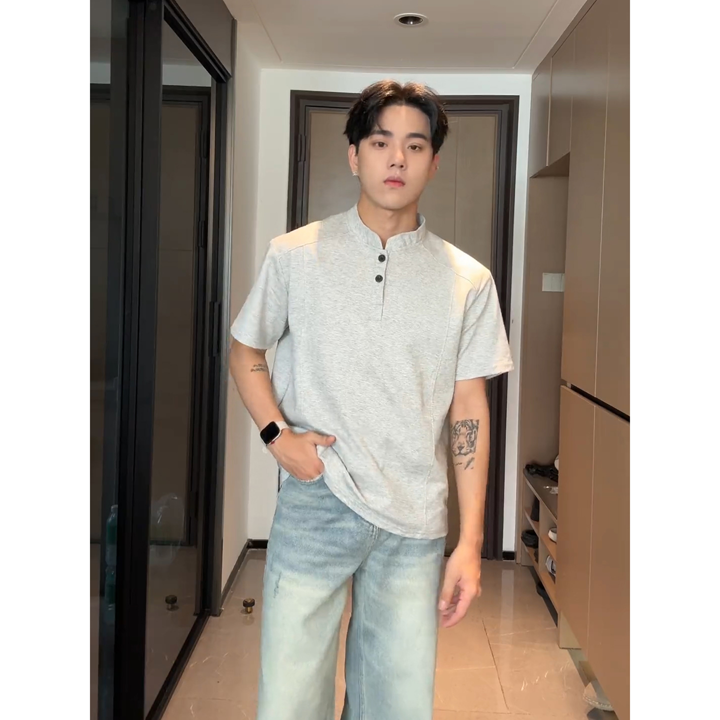 解构正肩polo衫 半截袖 短袖 oversize痞帅t恤亨利领短款 男夏季 美式