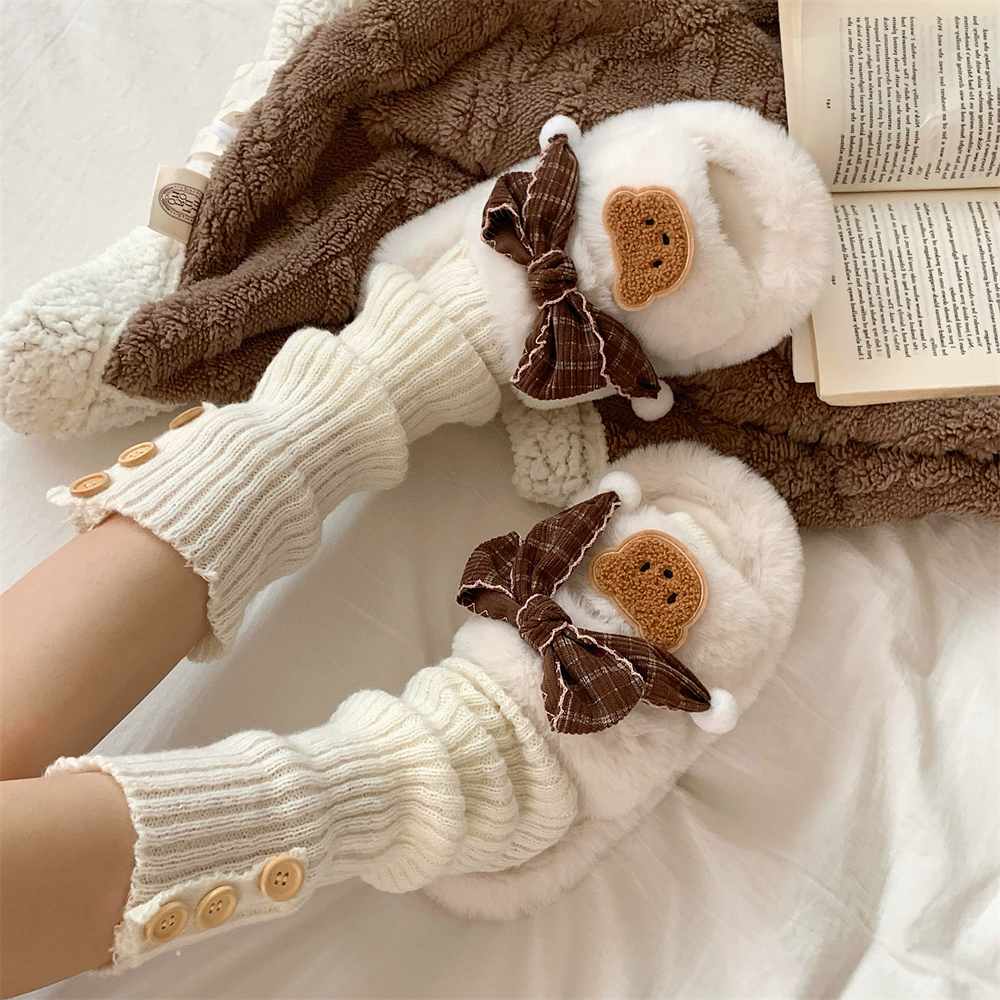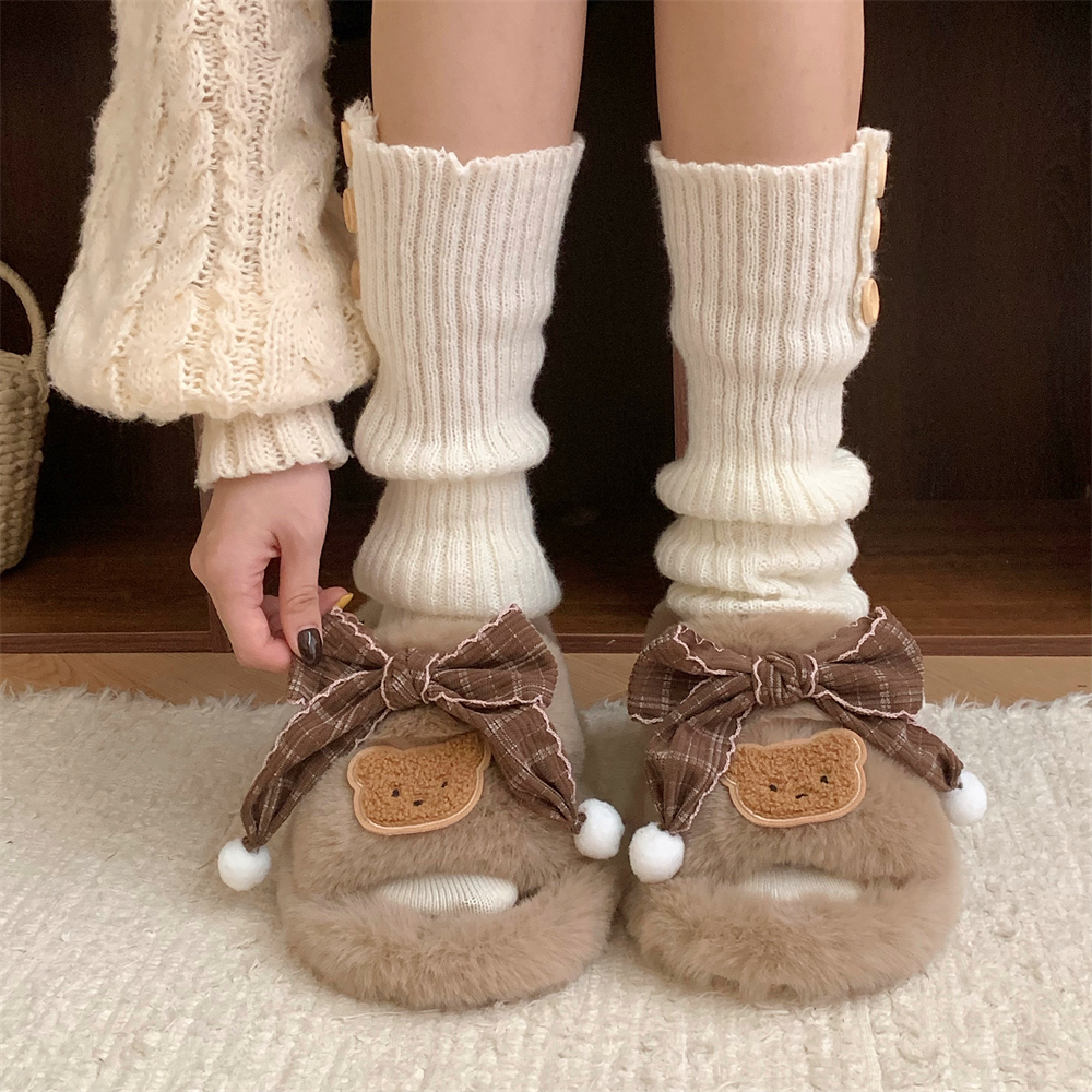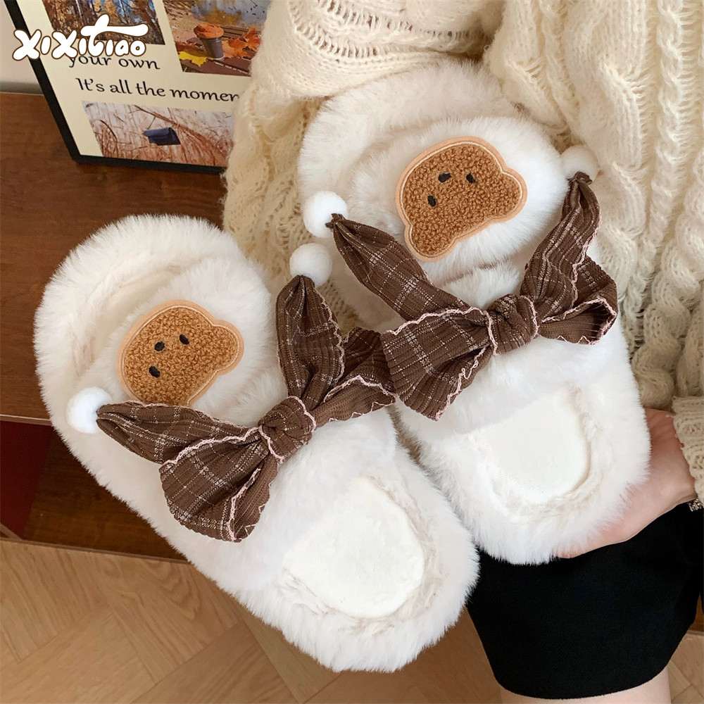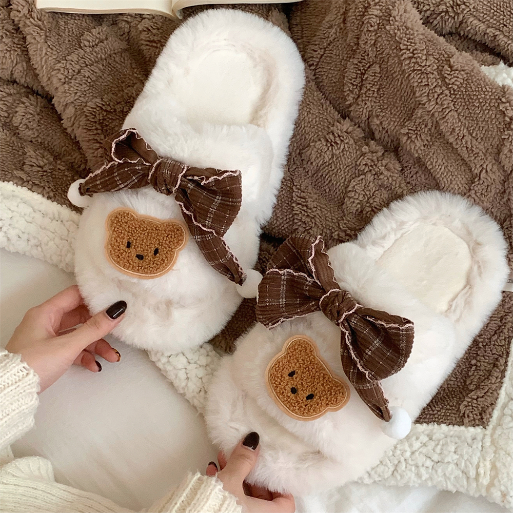 蝴蝶结小熊毛毛拖鞋 细细条 时尚 秋冬女士ins风新款 可爱二字棉拖鞋