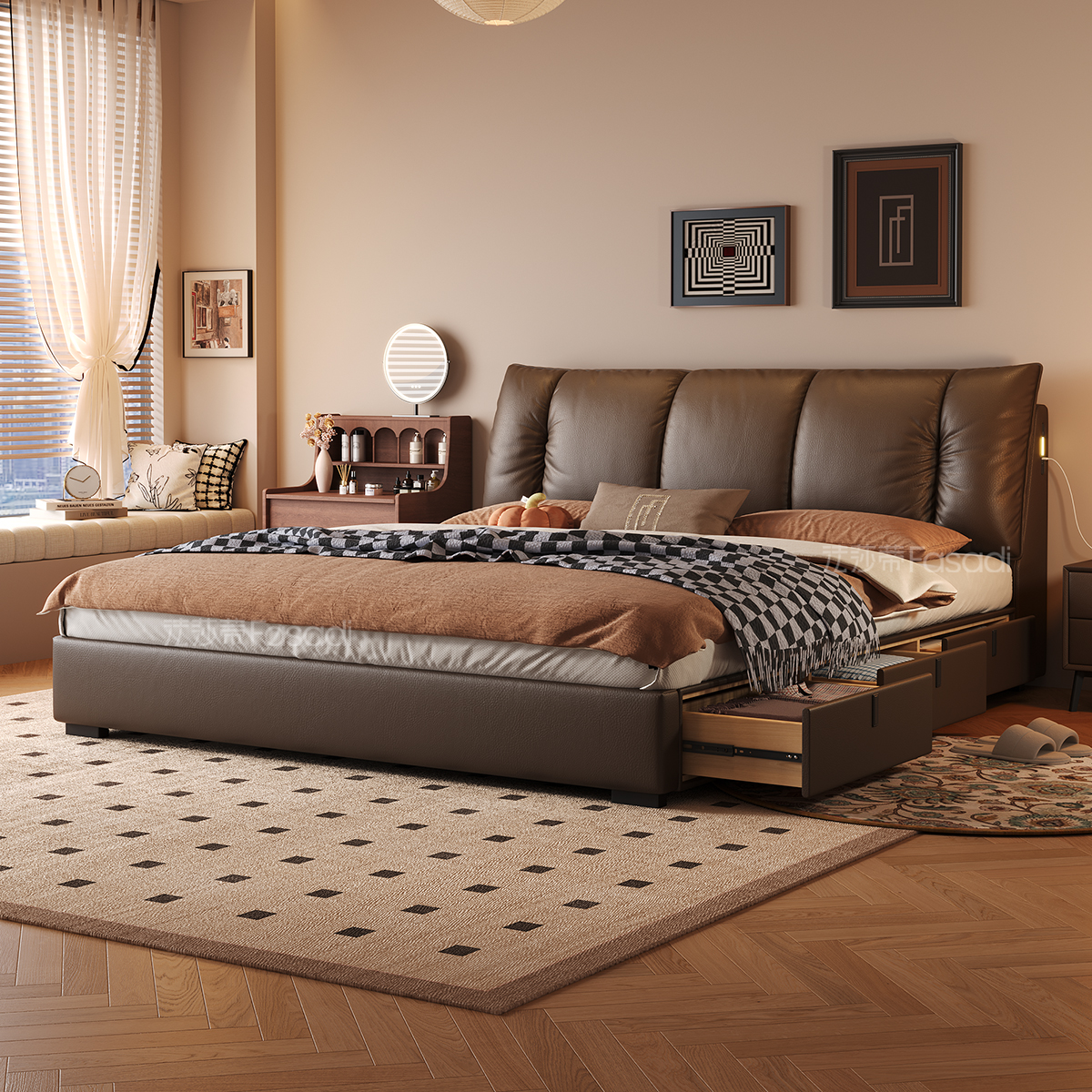 法莎蒂中古风窝窝真皮床高箱储物床意式 极简主卧床1米8双人软包床