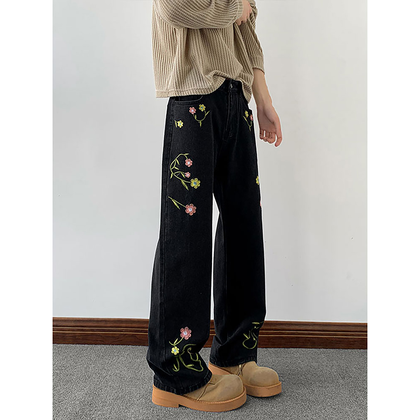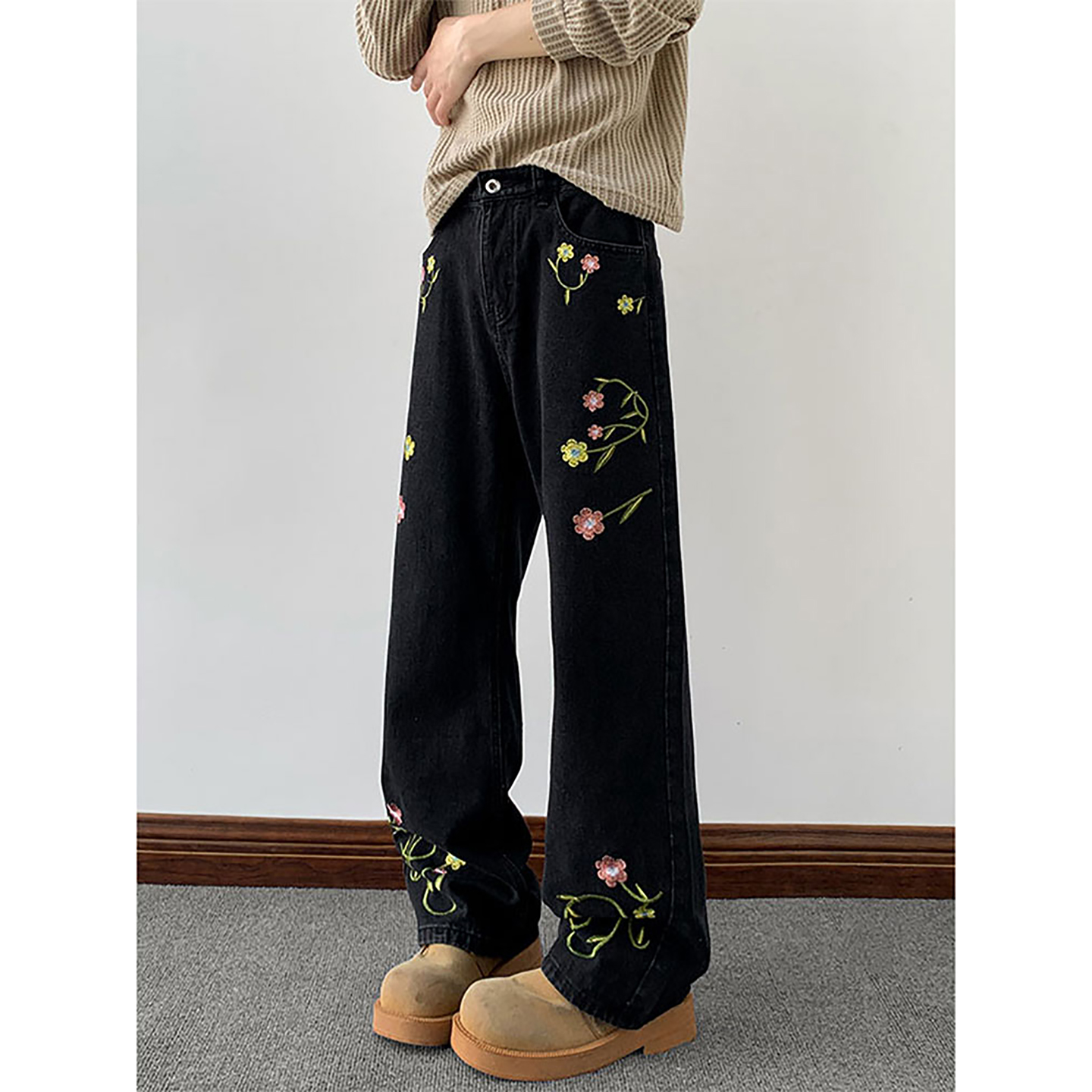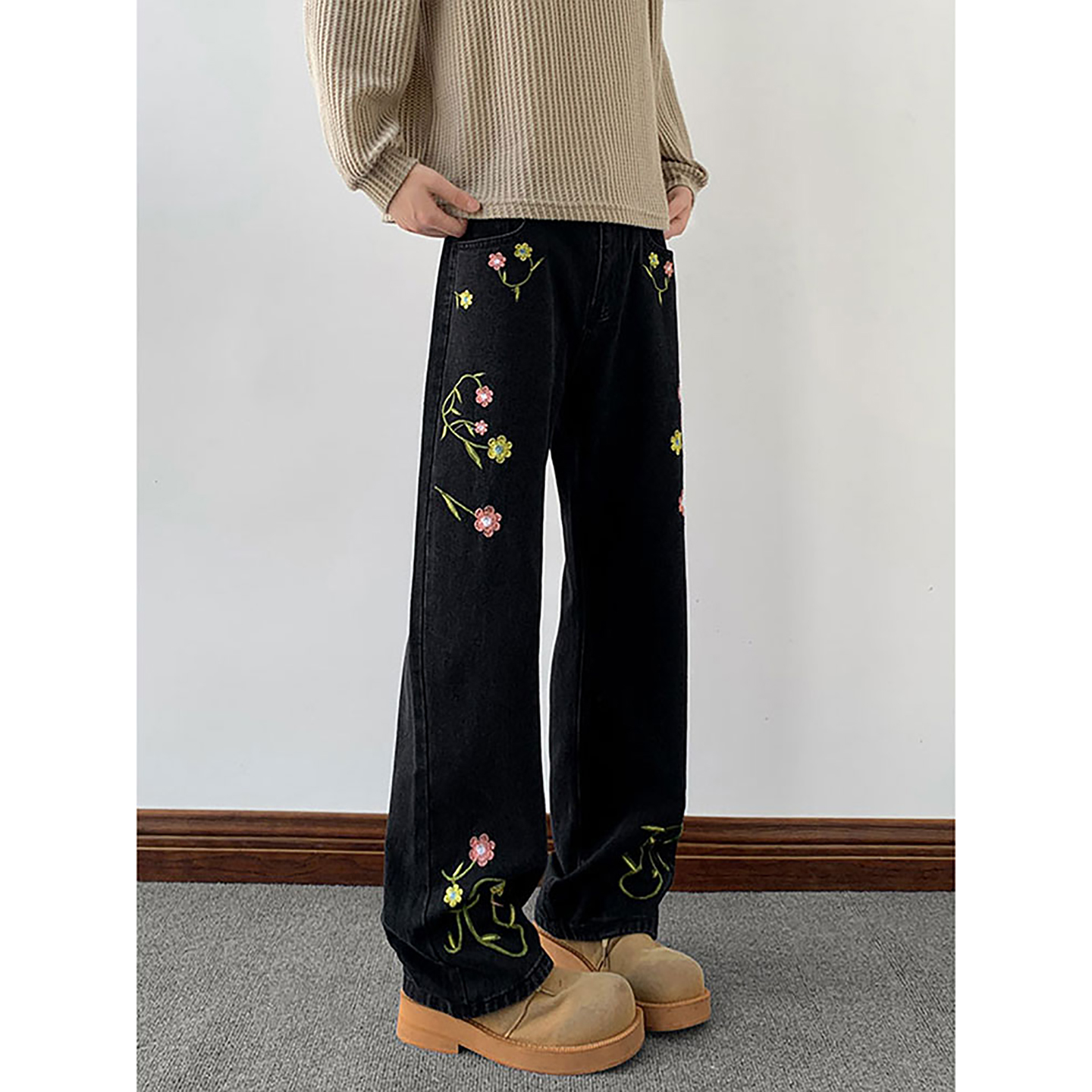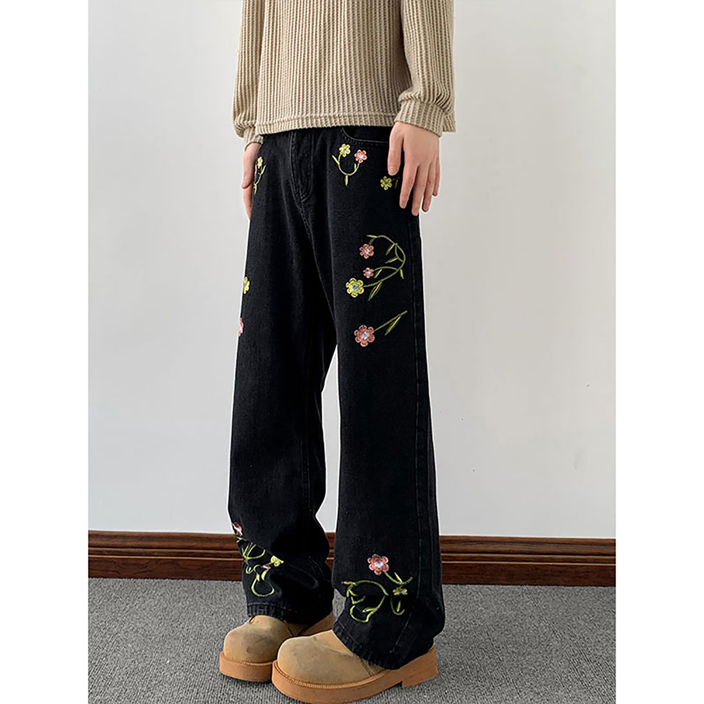 美式 秋季 高街vibe裤 子直筒修身 花卉刺绣黑色弯刀牛仔裤 微喇裤 男款