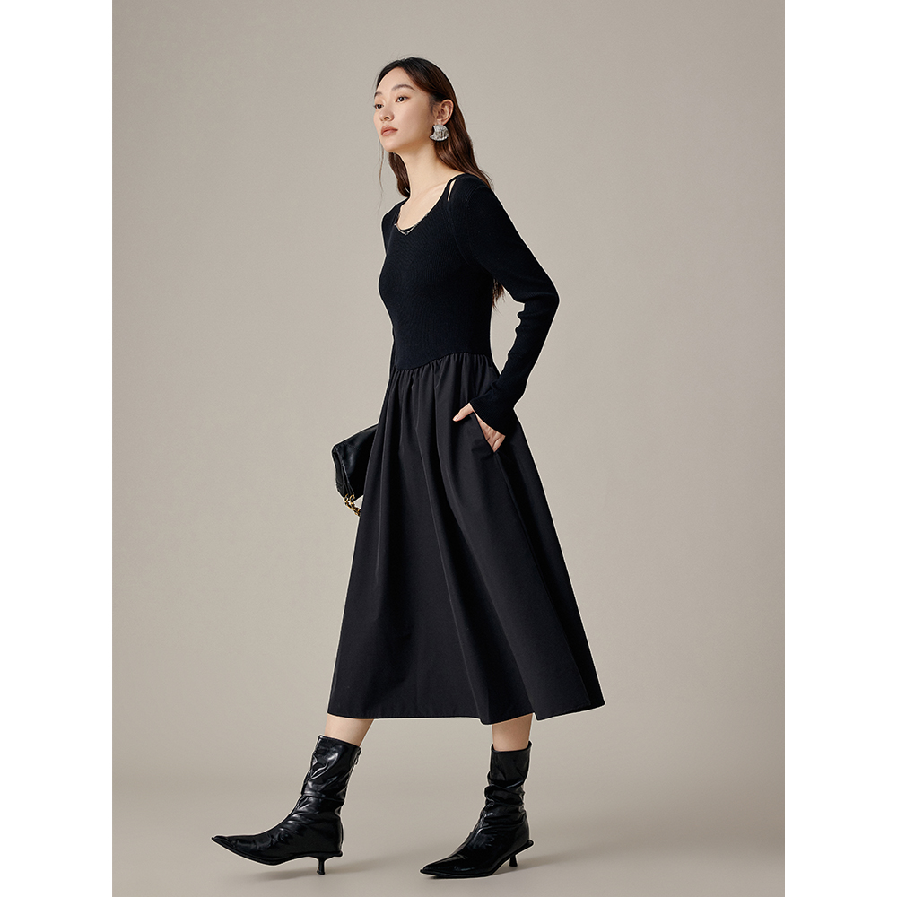 小黑裙子 气质流行韩版 衣香丽影黑色针织拼接连衣裙女2025秋装 新款