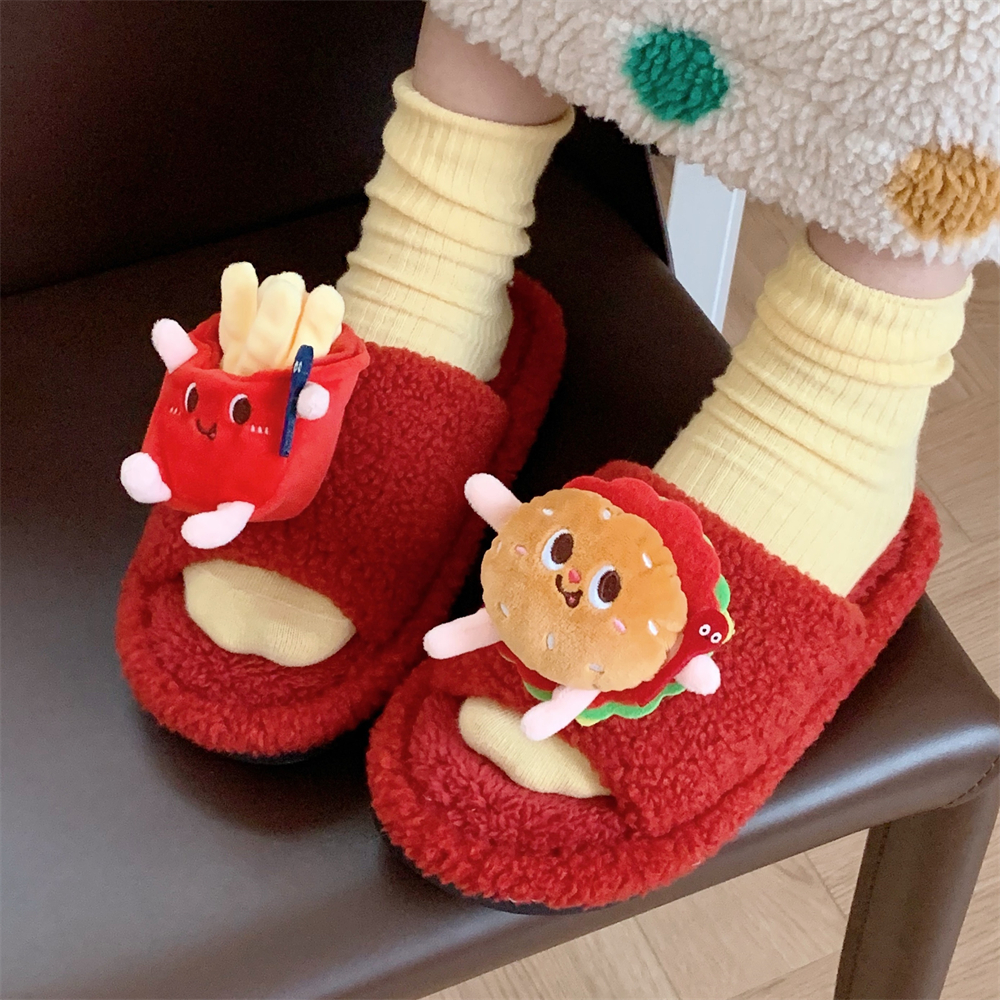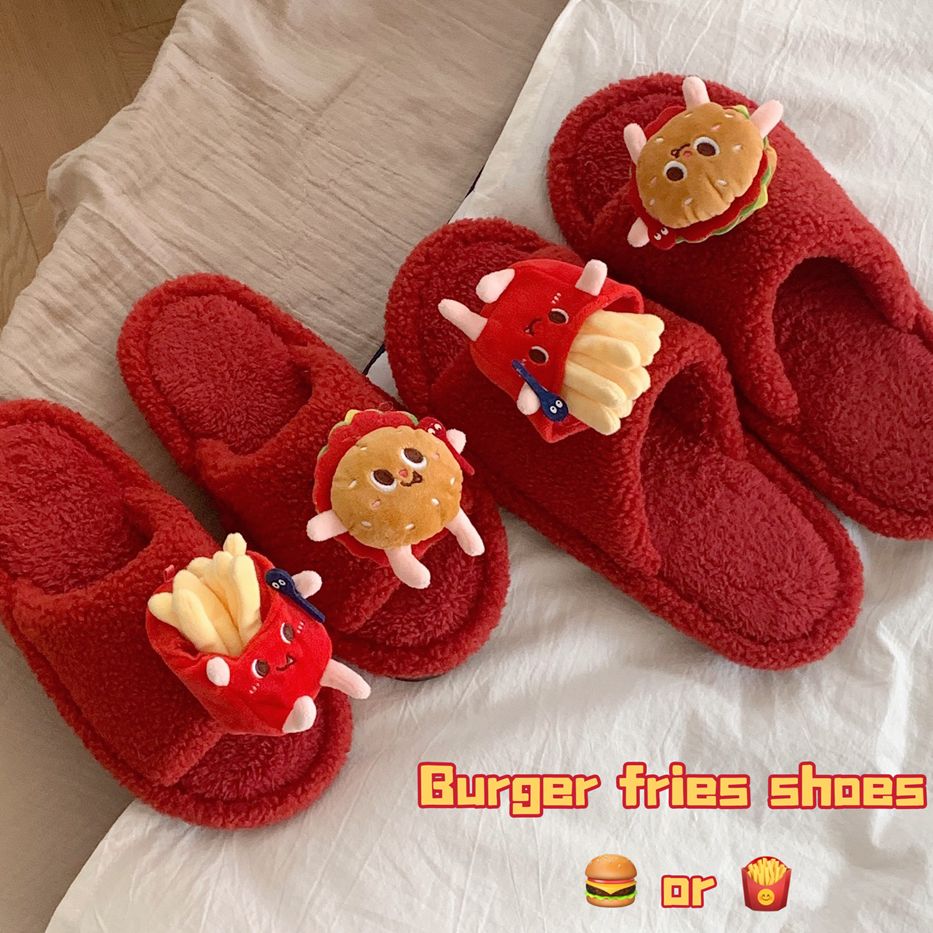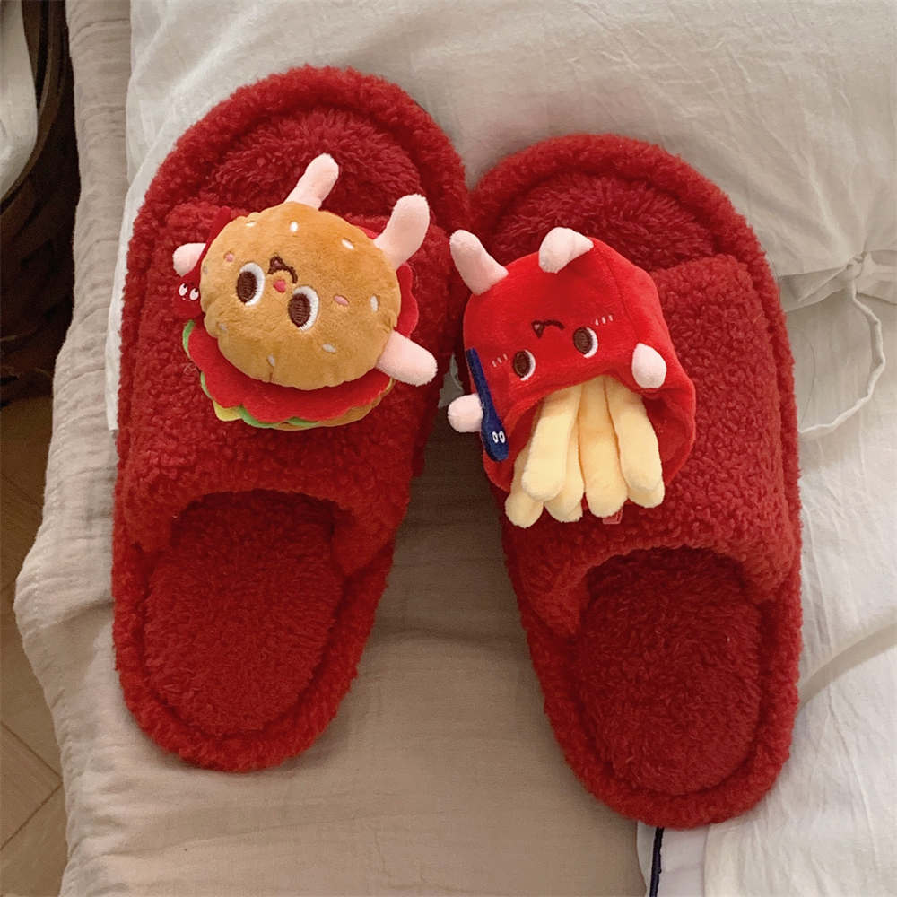 男女汉堡薯条秋冬棉拖鞋 红色拖鞋 ins风结婚喜庆高级时尚 休闲个性