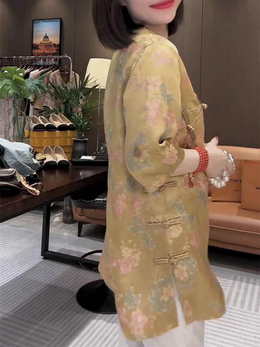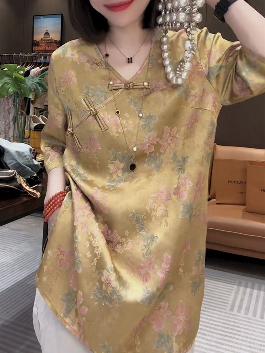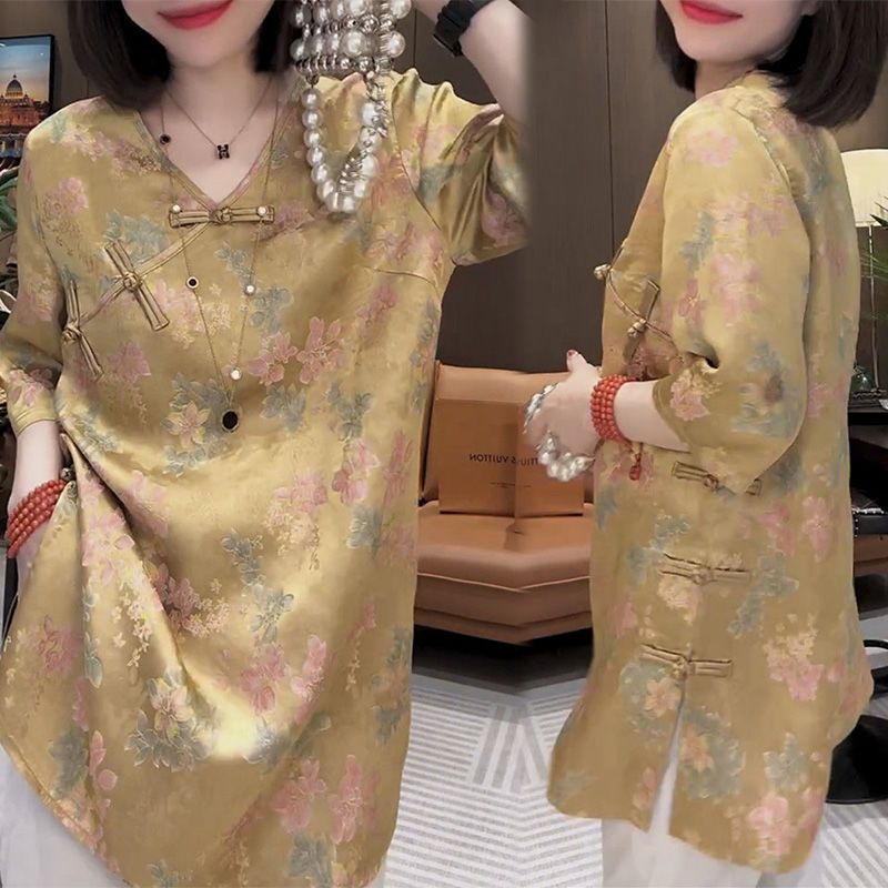 新中式 气质衬衫 夏季 洋气盘扣七分袖 新款 国风复古印花上衣V领小衫