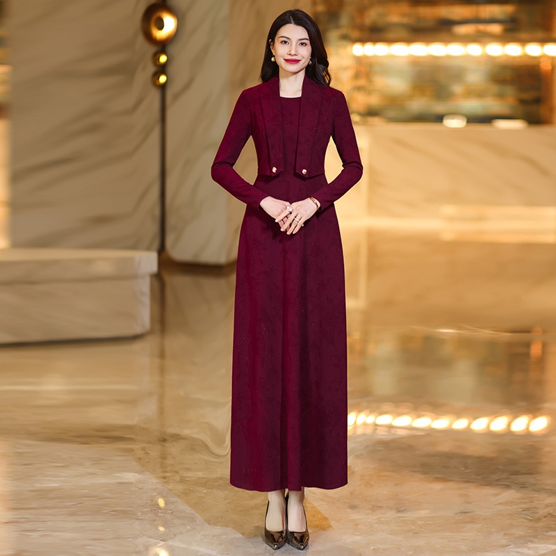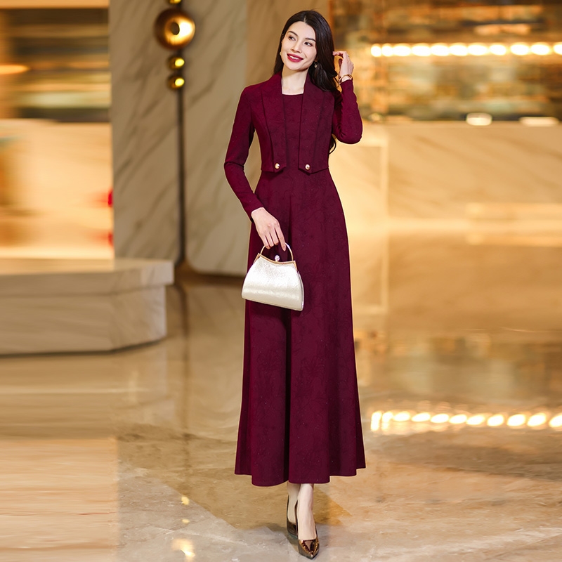 裙子气质假两件显瘦长裙 长款 酒红色高级感连衣裙女2025秋装 新款