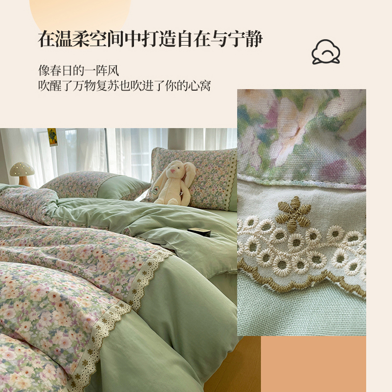 无印良品法式 复古床上四件套双层皱皱纱全棉公主花边纯棉被套床单