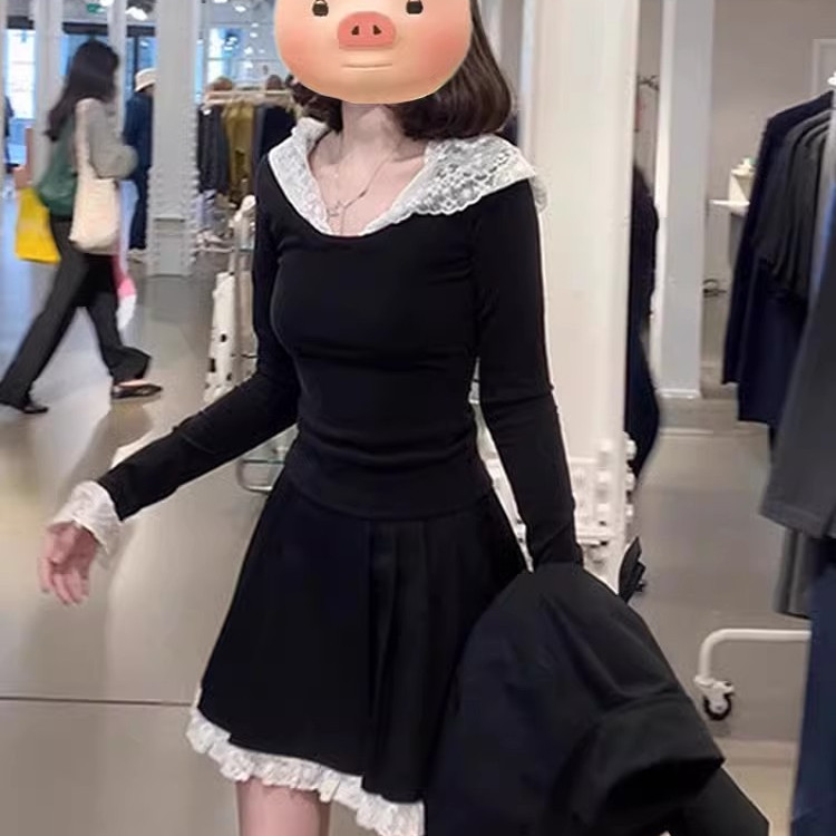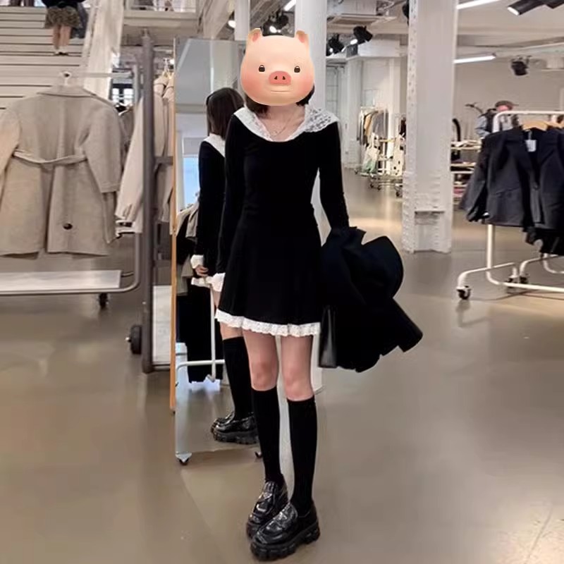2025新款 高级感蕾丝拼接短裙子 小个子黑色连帽连衣裙子女早春秋季