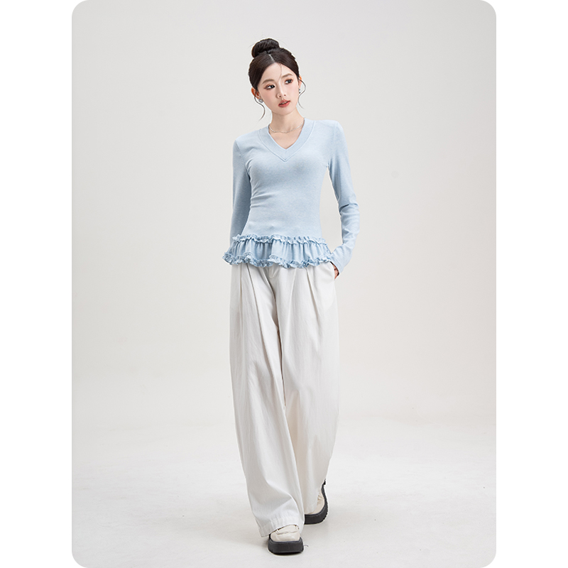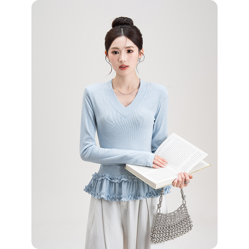 T恤2025秋季 内搭打底衫 新款 修身 花边下摆上衣 女装 蓝色V领拼接长袖