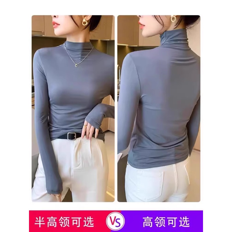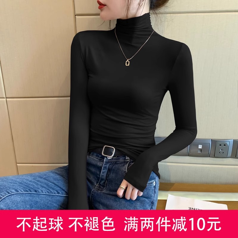 长袖 薄款 黑色上衣T恤 女春秋冬高领内搭堆领修身 莫代尔洋气打底衫