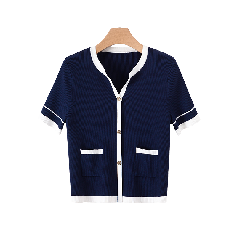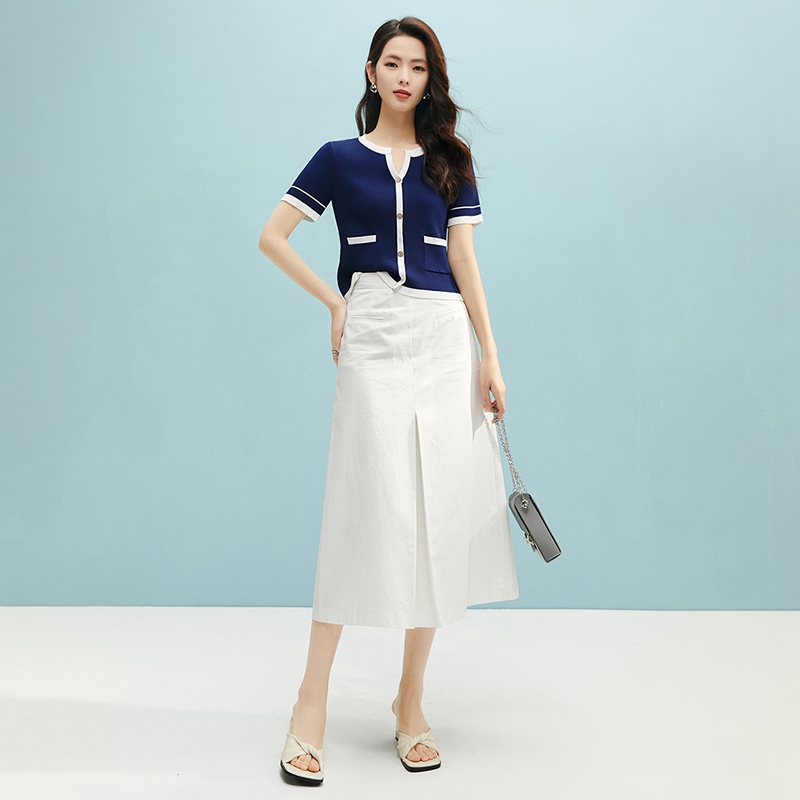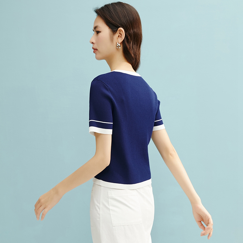 女 简约气质上衣休闲弹力撞色针织短袖 晚白2025年夏新款 时尚