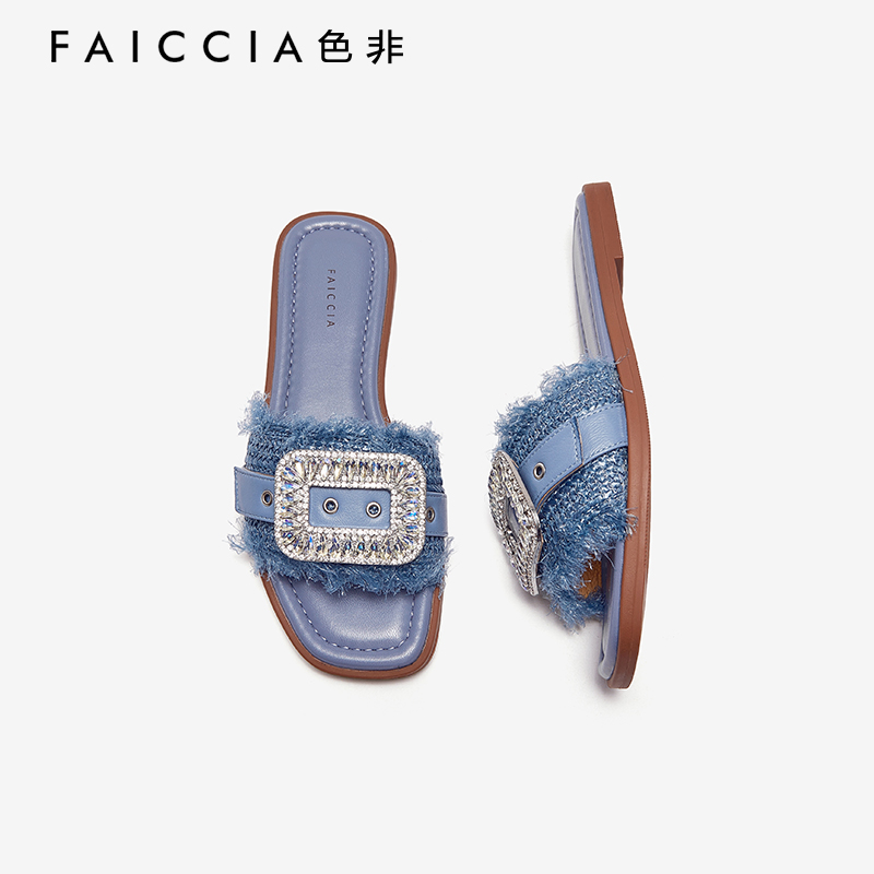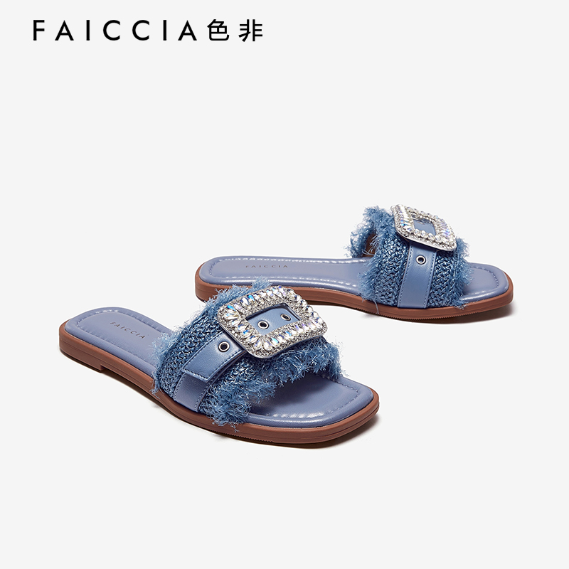 小众设计高级感度假平底拖鞋 女2025夏新款 方扣水钻凉拖鞋 色非法式