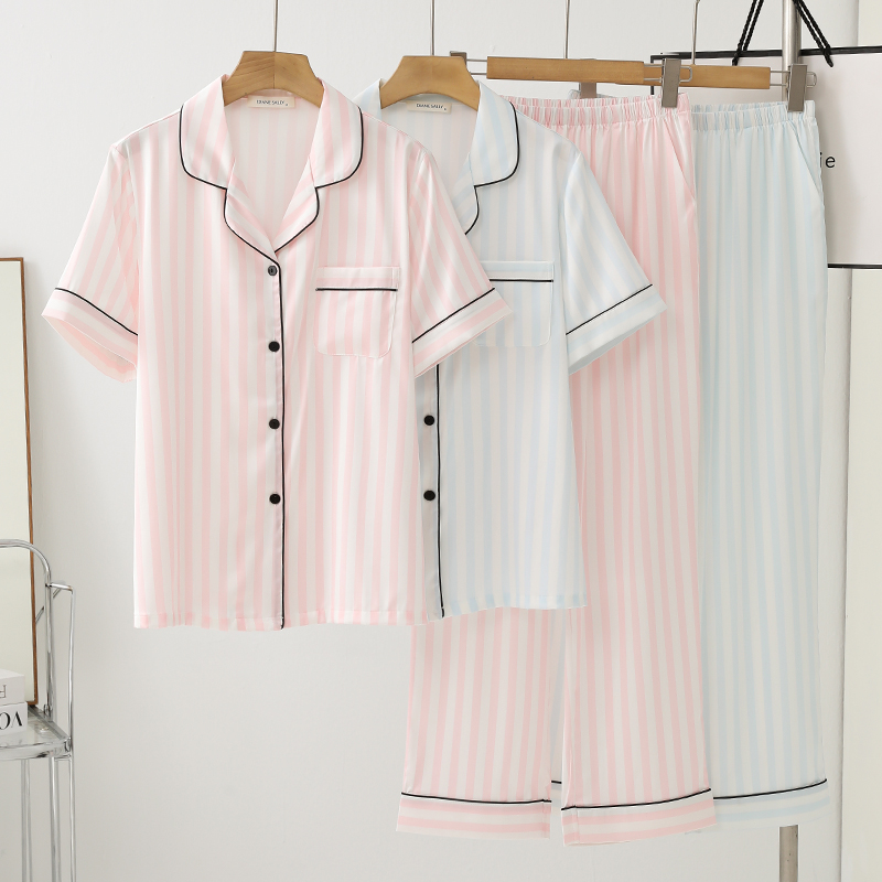 两件套高级感可外穿家居服女夏款 长裤 短袖 甜美条纹冰丝睡衣女夏季