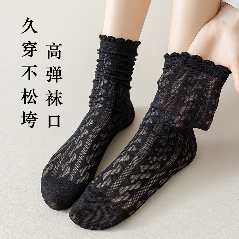 长袜 中筒袜棉袜竹纤维堆堆袜夏季 黑色蕾丝花边袜子春秋季 配小皮鞋