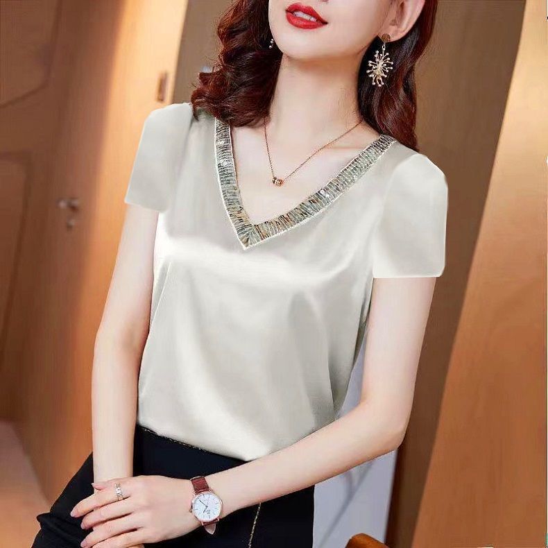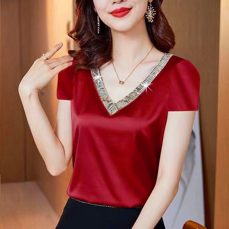 醋酸缎面衬衫 丝绸t恤女短袖 V领大码 新款 夏天胖mm宽松上衣 2025夏装