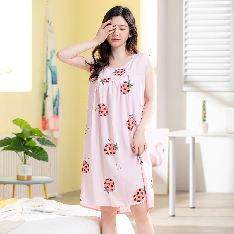 羽艺睡裙女夏天人棉无袖 中裙家居服 宽松棉绸睡衣女生可爱圆领薄款