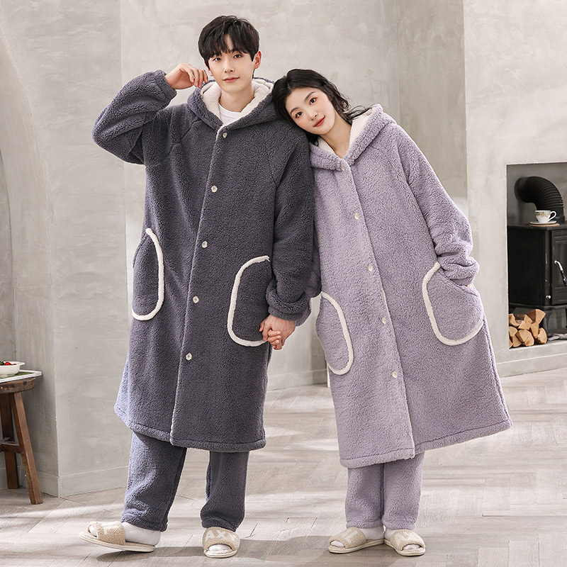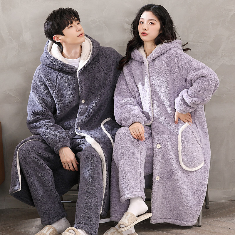 法兰绒浴袍家居服 睡袍加绒加厚男士 秋冬季 情侣珊瑚绒睡衣女长款