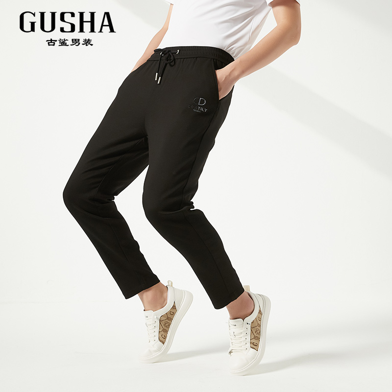 男凉感透气刺绣休闲卫裤 古鲨黑色弹力系带松紧裤 2025年秋 清仓