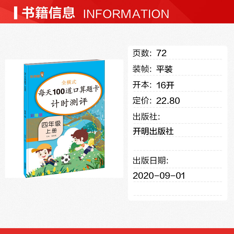小学教辅文教 社 上册 开明出版 图书籍 新华书店正版 编 钱赛湖 彩绘版 4年级 每天100道口算题卡计时测评