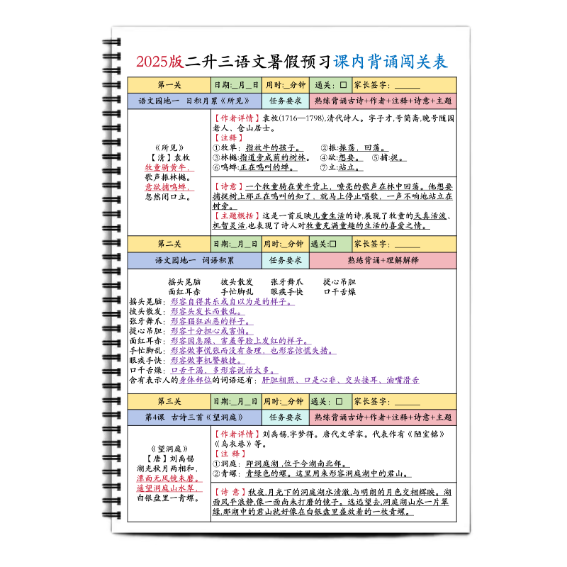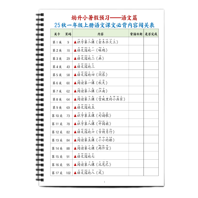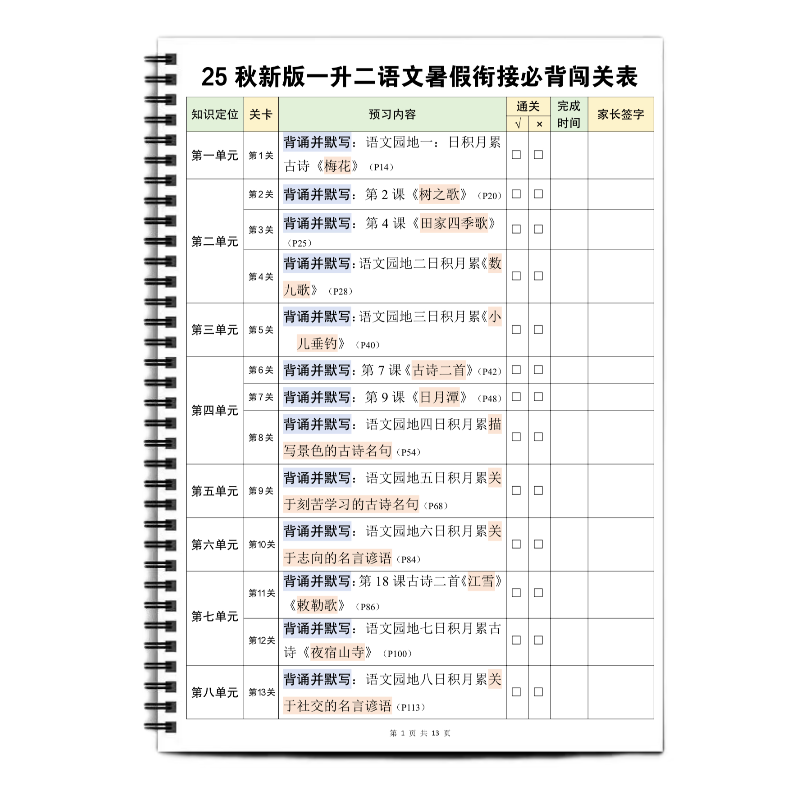 2025秋小学一二三四五六年级上册语文暑假闯关表课内必背内容打卡预习衔接老师推荐 默写一升二识字6年级阅读背诵 三升四古诗新版
