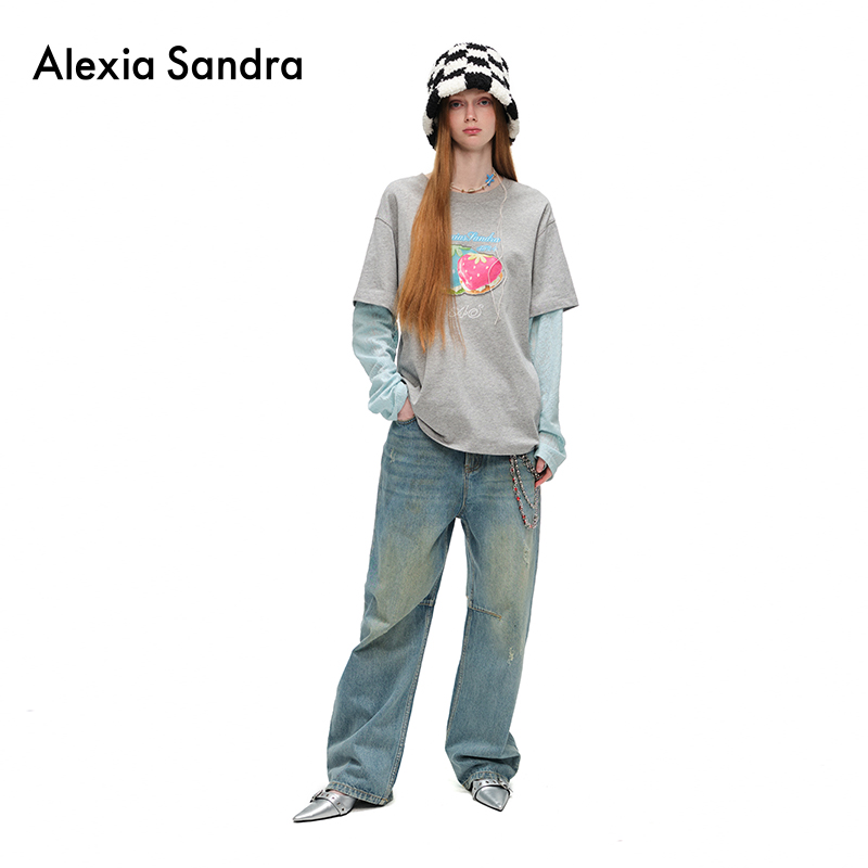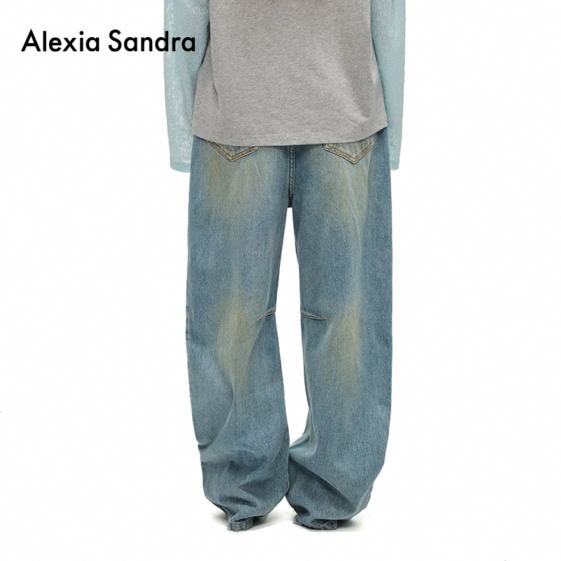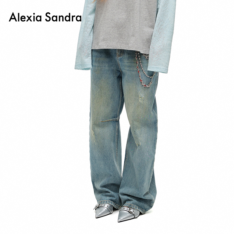 女 Sandra深蓝色宽松做旧破洞直筒牛仔裤 侯明昊沈梦辰同款 Alexia