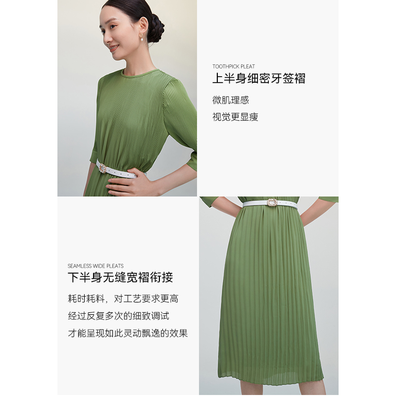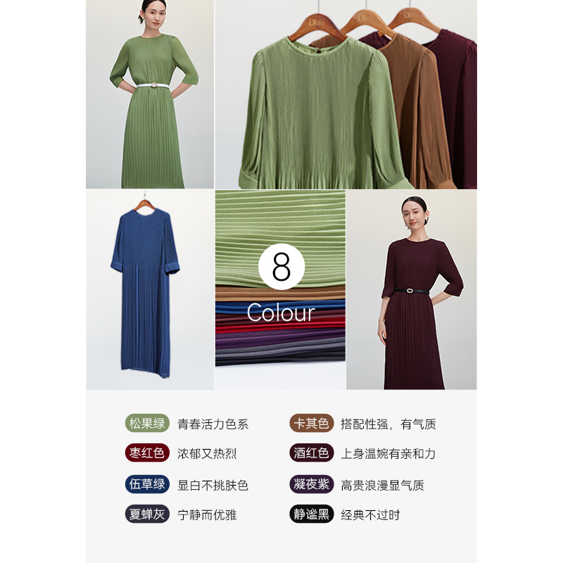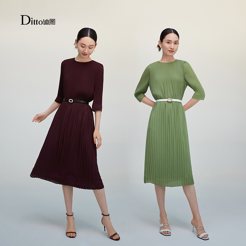 迪图优雅知性气质连衣裙女2023春夏新款 纯色圆领飘逸显瘦百褶裙子
