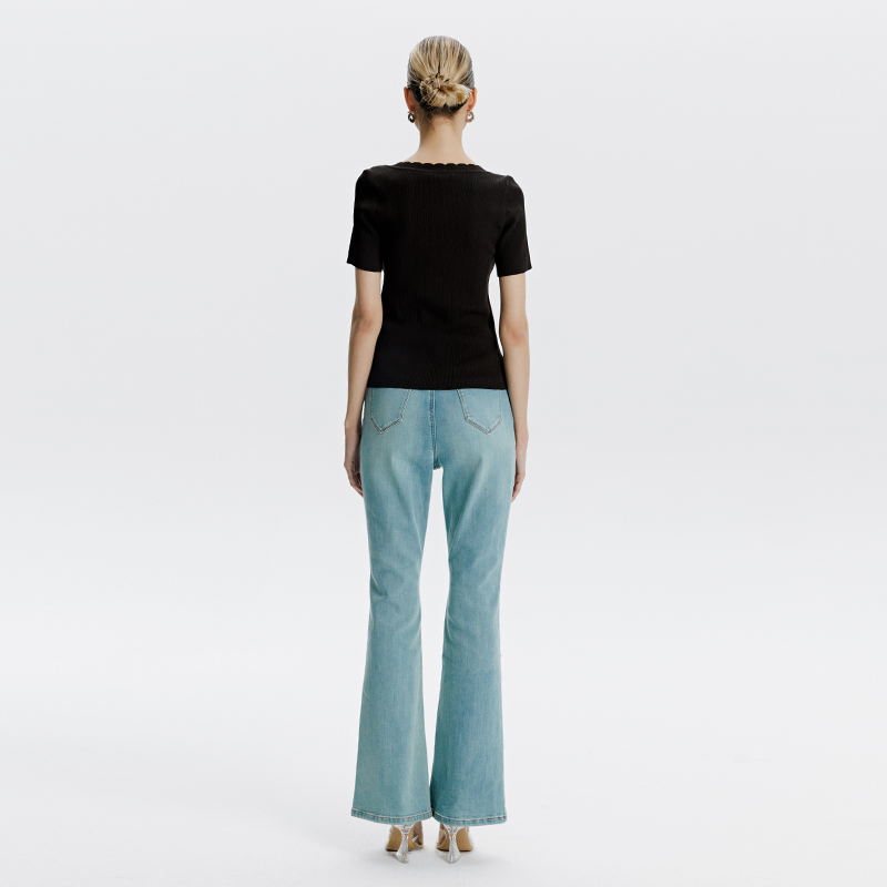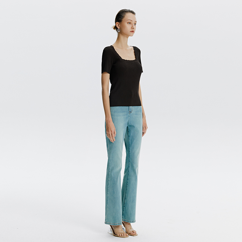 气质显瘦U领花边针织上衣 修身 BLUE轻奢优雅女装