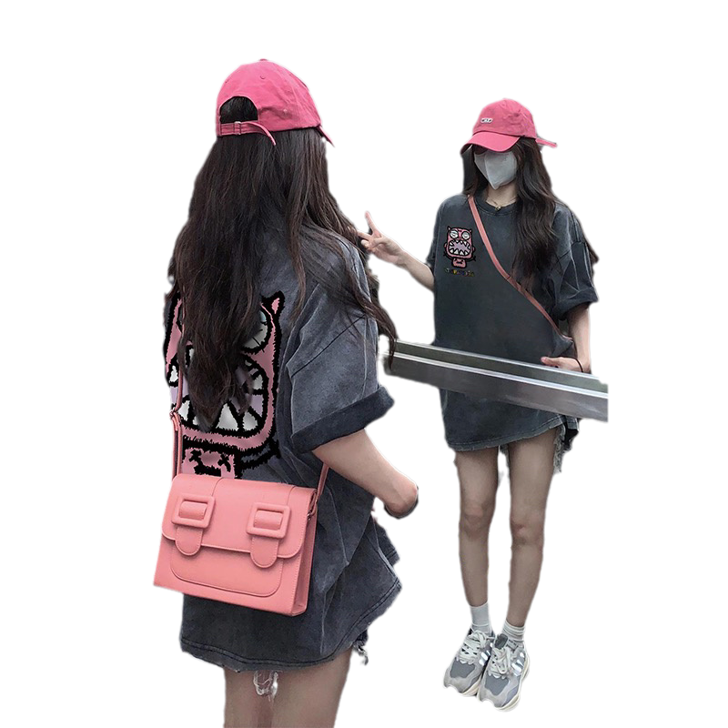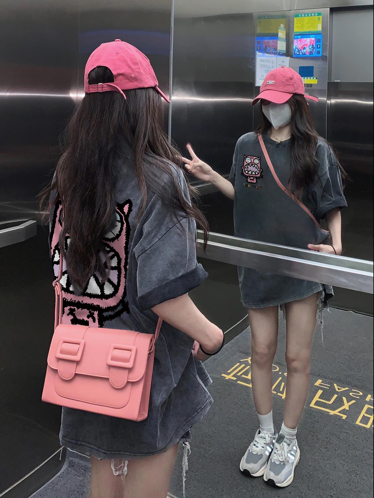 情侣装 美式 宽松纯棉上衣夏季 T恤女设计感小众中长款 高街复古短袖