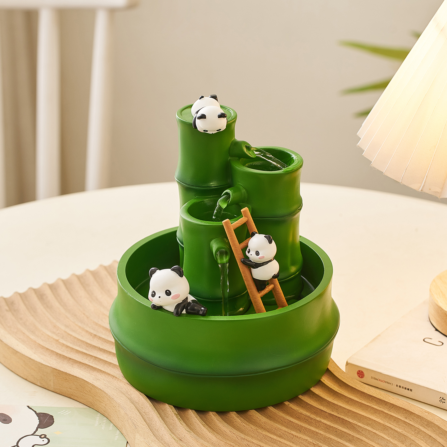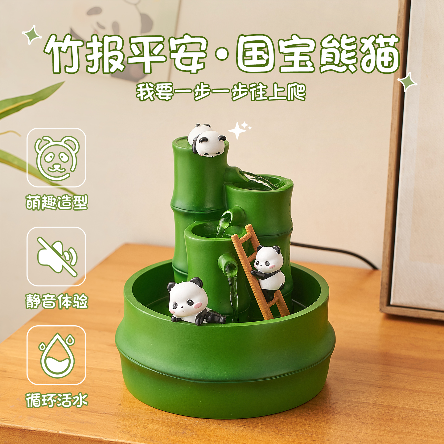 创意熊猫流水摆件循环水景小型办公室桌面生财风水轮客厅玄关招财