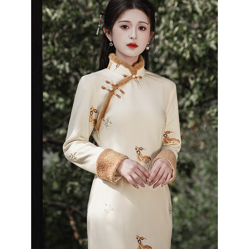 改良年轻款 麂皮绒2025新款 小鹿刺绣日常可穿 国风旗袍秋冬季 新中式