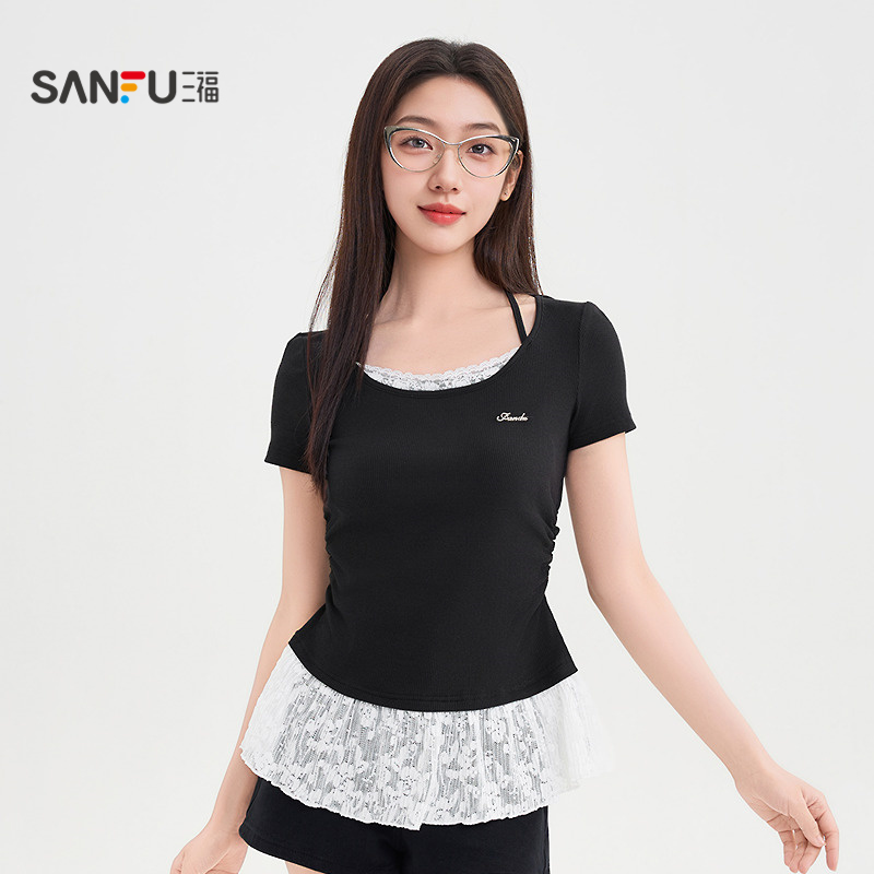 设计感蕾丝拼接假两件上衣女装 夏季 500733 T恤女2025新款 三福短袖