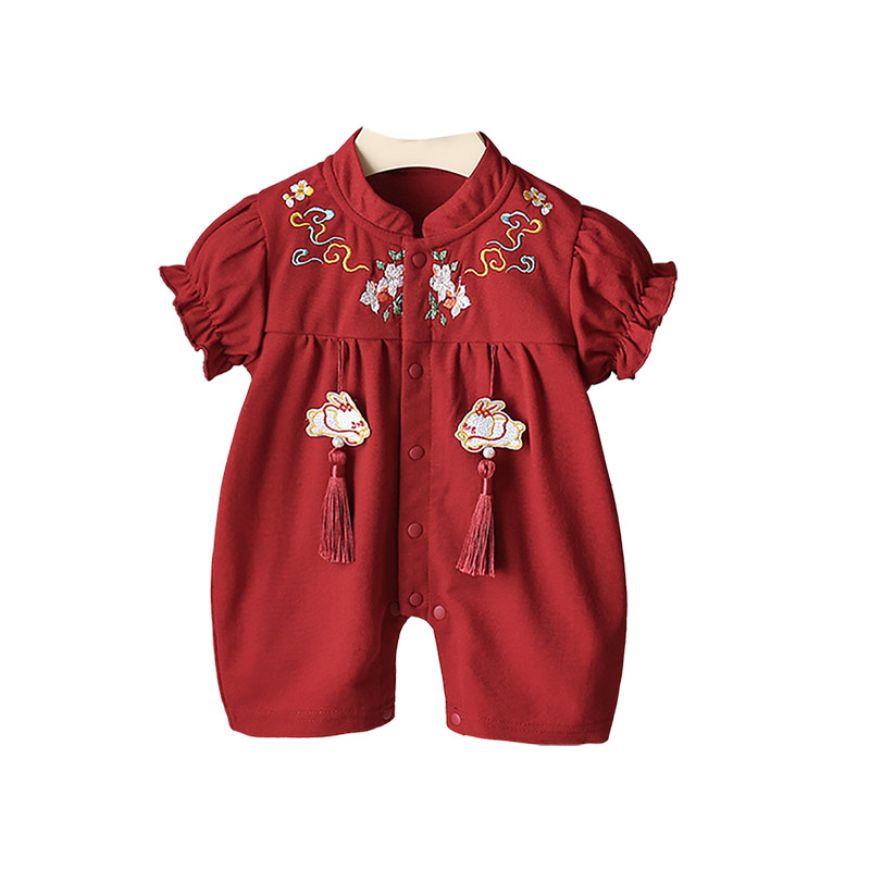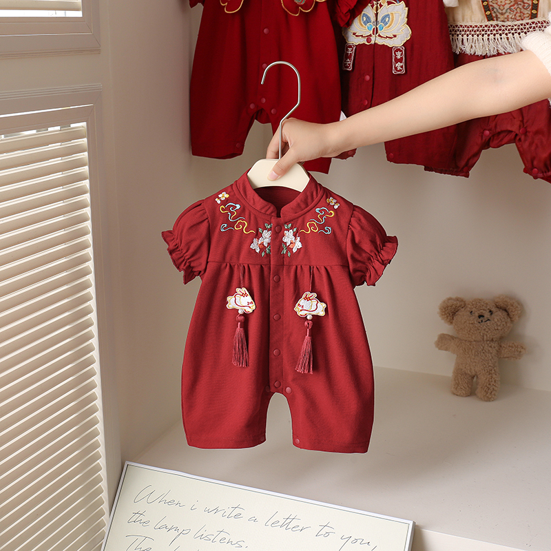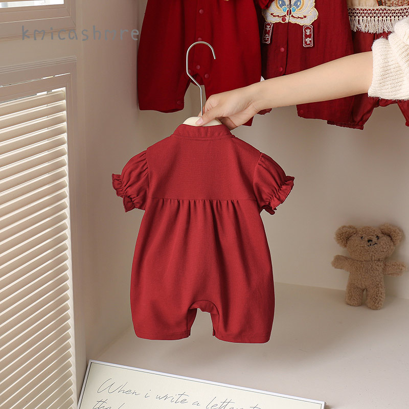 薄款 刺绣哈衣夏季 红色喜庆抓周岁礼服 女宝宝中式 kmi新生婴儿夏装