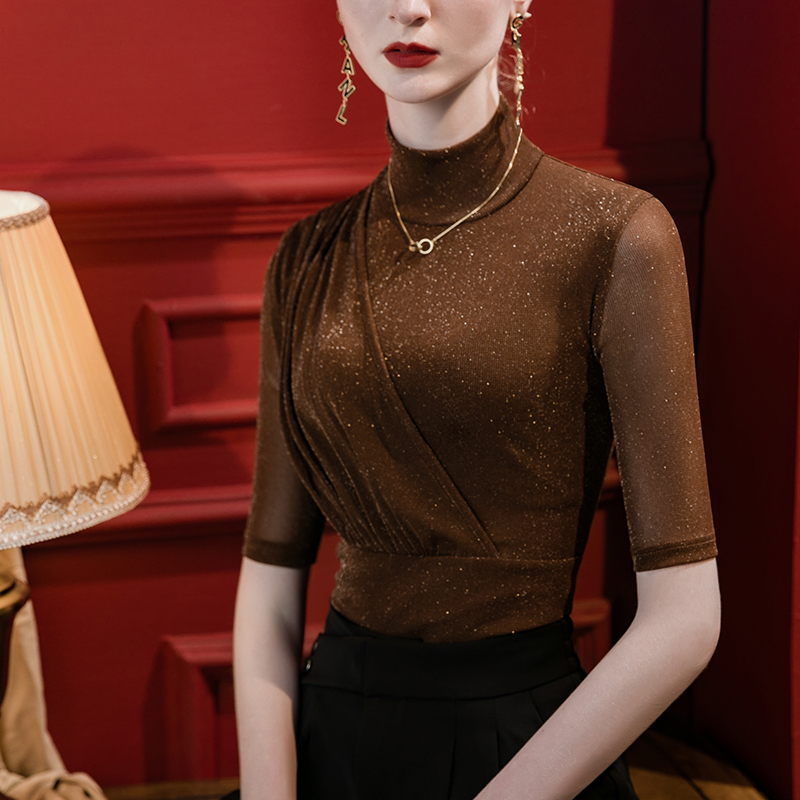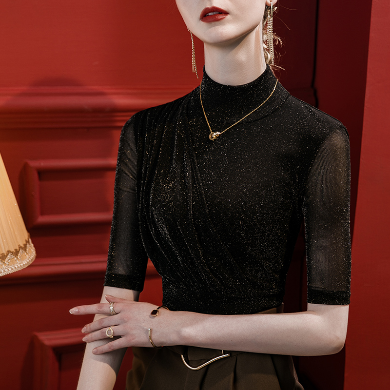 修身 2025秋季 女五分袖 半高领亮丝网纱打底衫 内搭洋气中上衣 新款