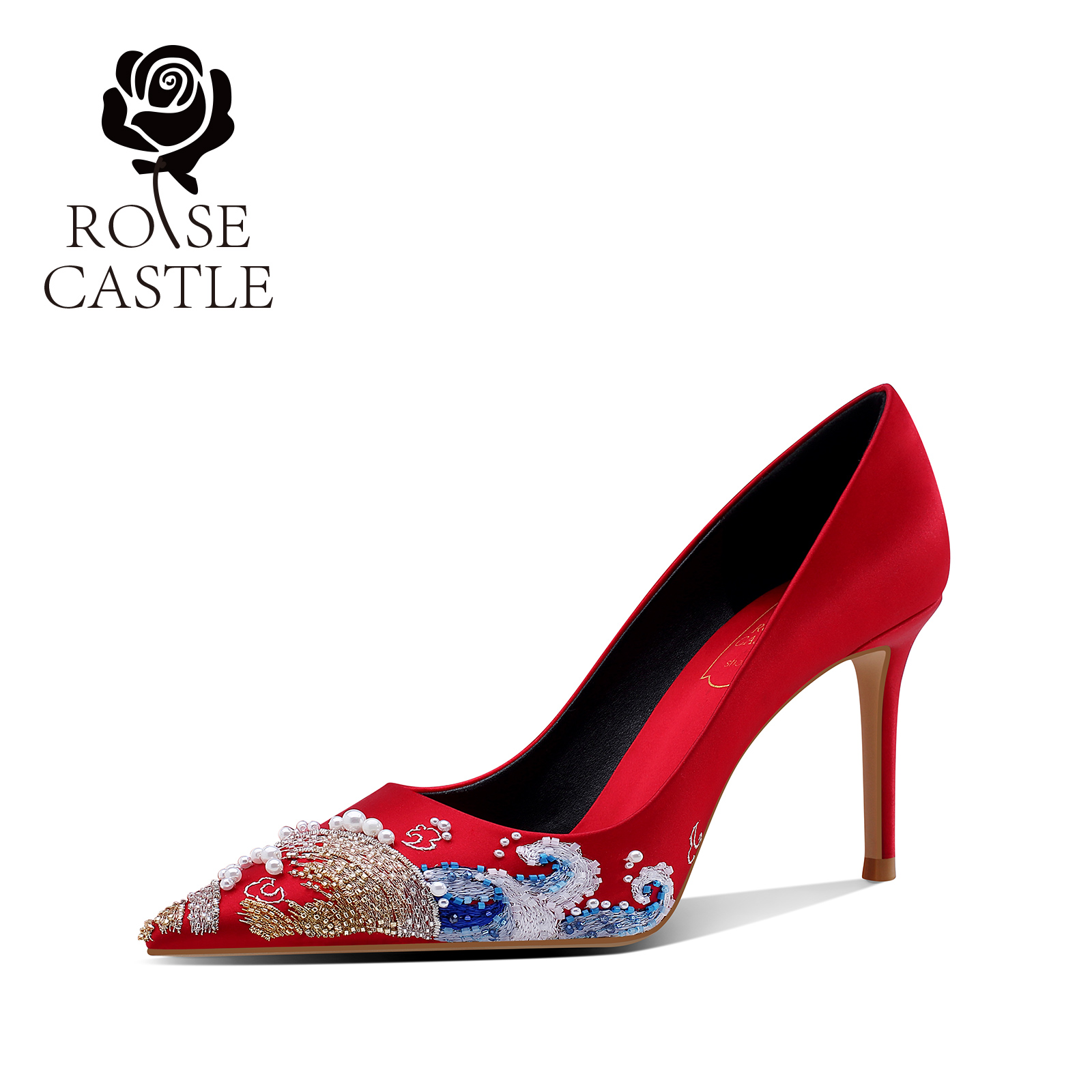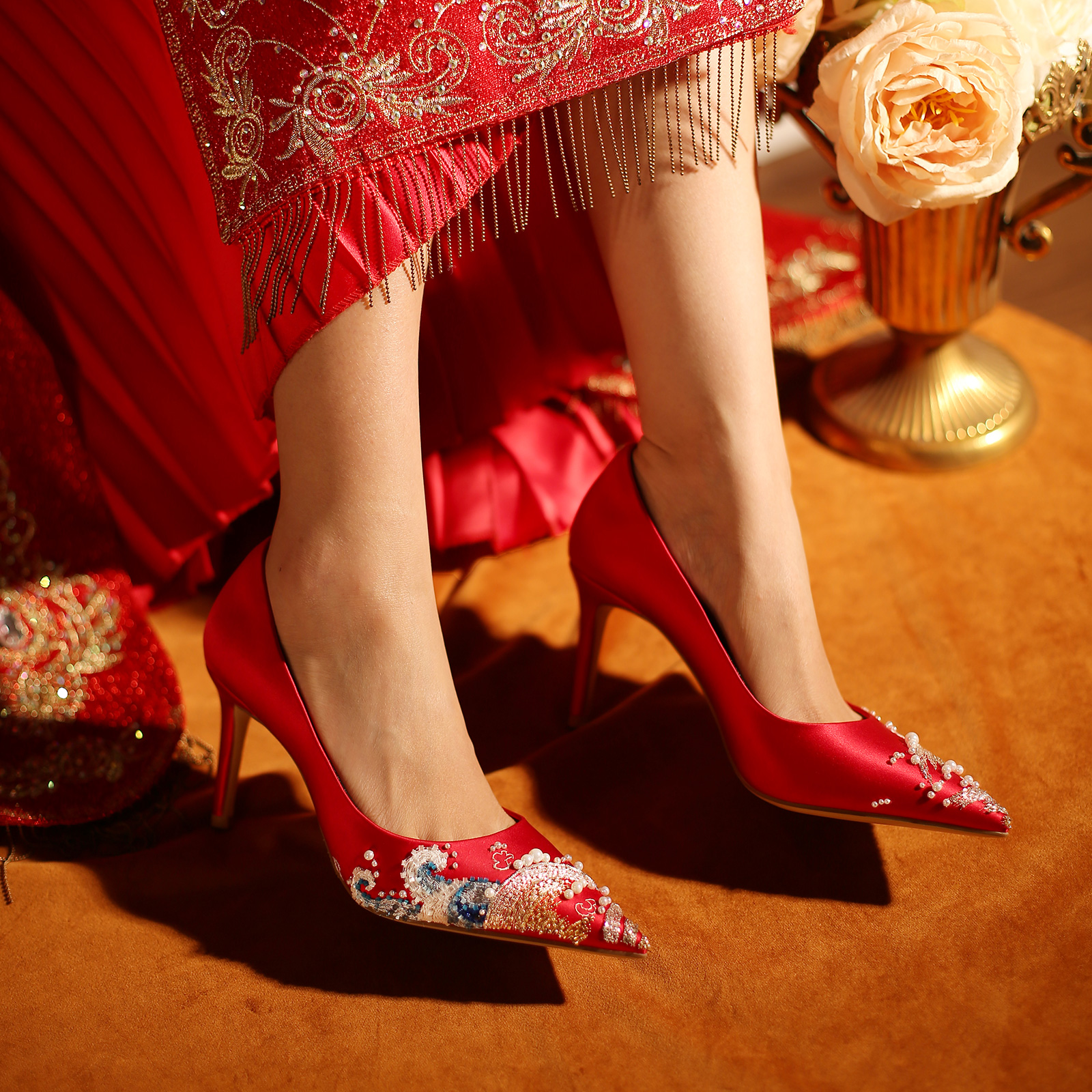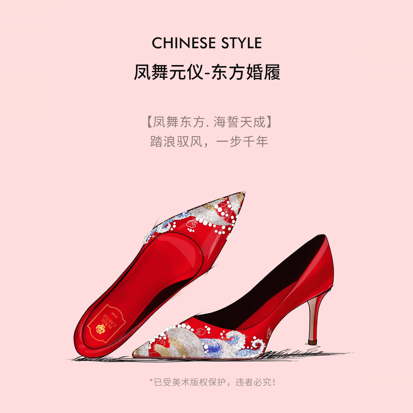 红色国风秀禾高跟礼服鞋 女手工刺绣新娘鞋 仪rosecastle婚鞋 凤舞元