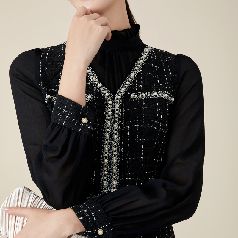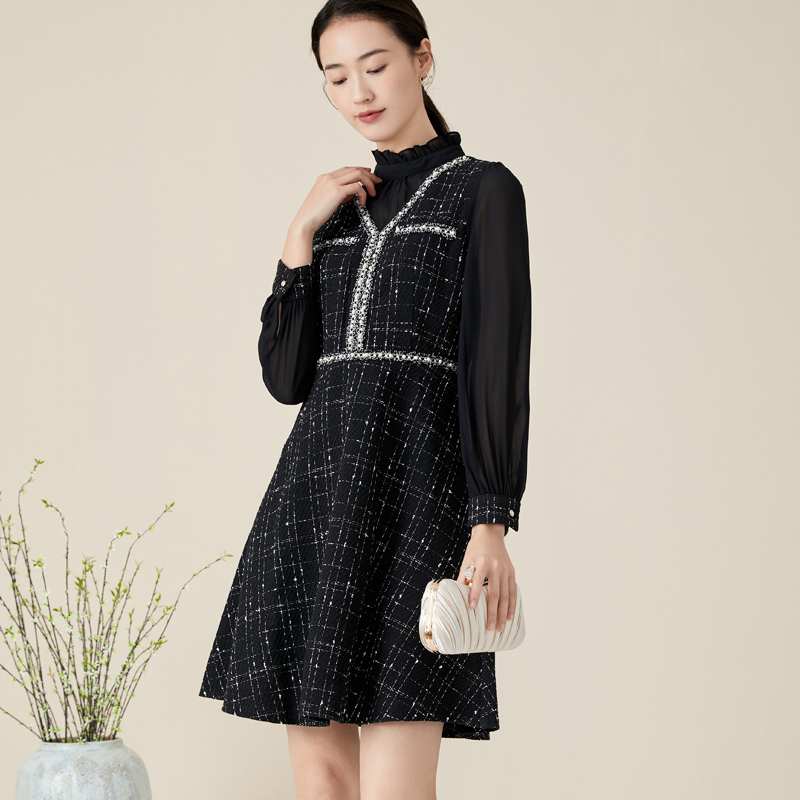 裙 中长款 玳莎小香风气质连衣裙秋冬新款 A字裙立领拼接女装