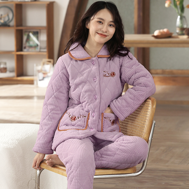 夹棉袄家居服女士冬天法兰绒套装 睡衣女秋冬季 三层加厚珊瑚绒大码