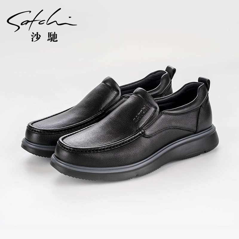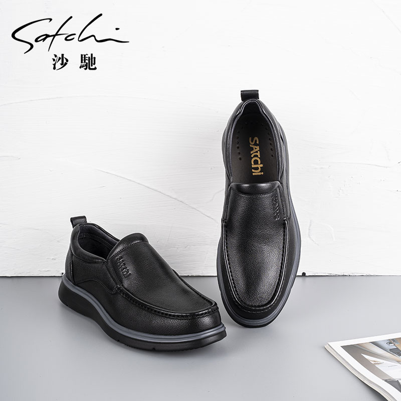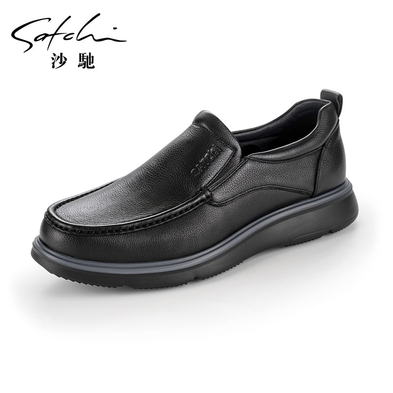 轻质柔软舒适透气一脚蹬黑牛皮鞋 沙驰男鞋 真皮休闲鞋 春秋新款 皮鞋