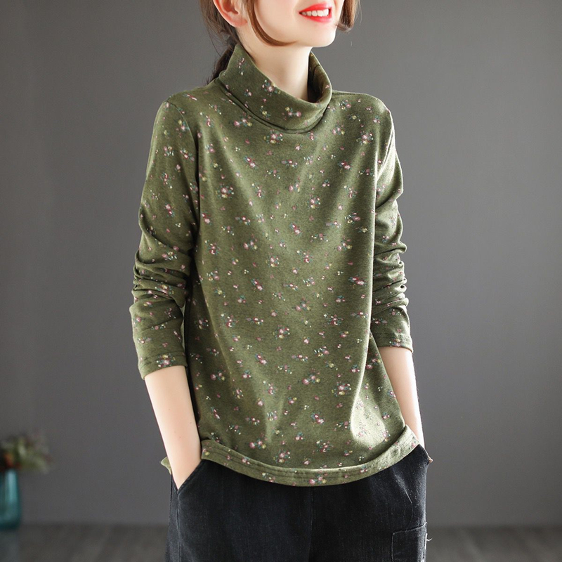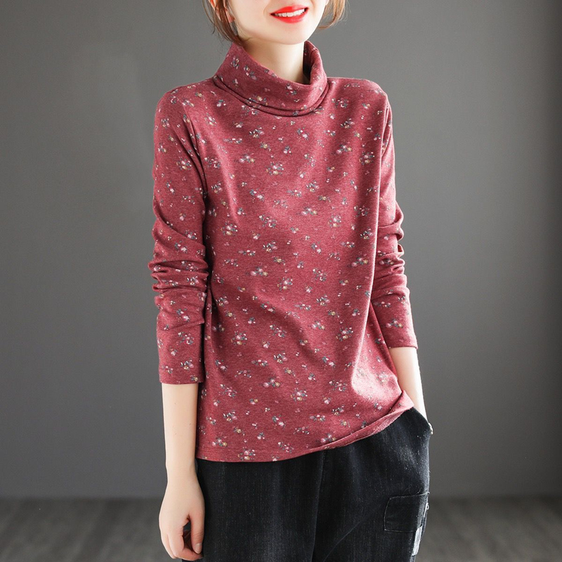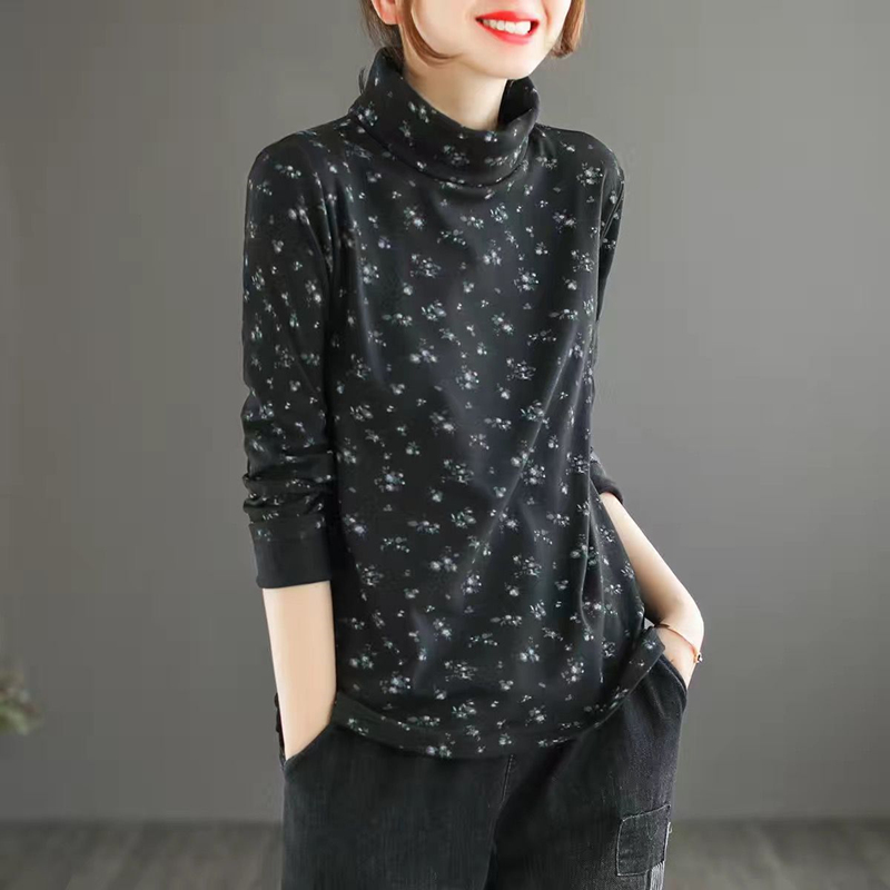 碎花长袖 休闲复古高领打底衫 女装 大码 文艺t恤女内搭上衣 女春秋季