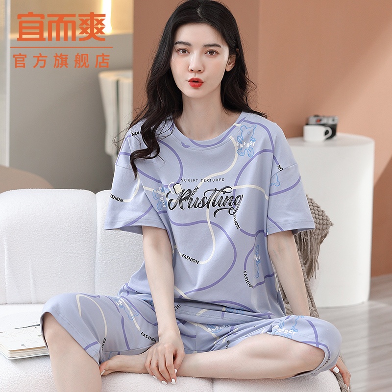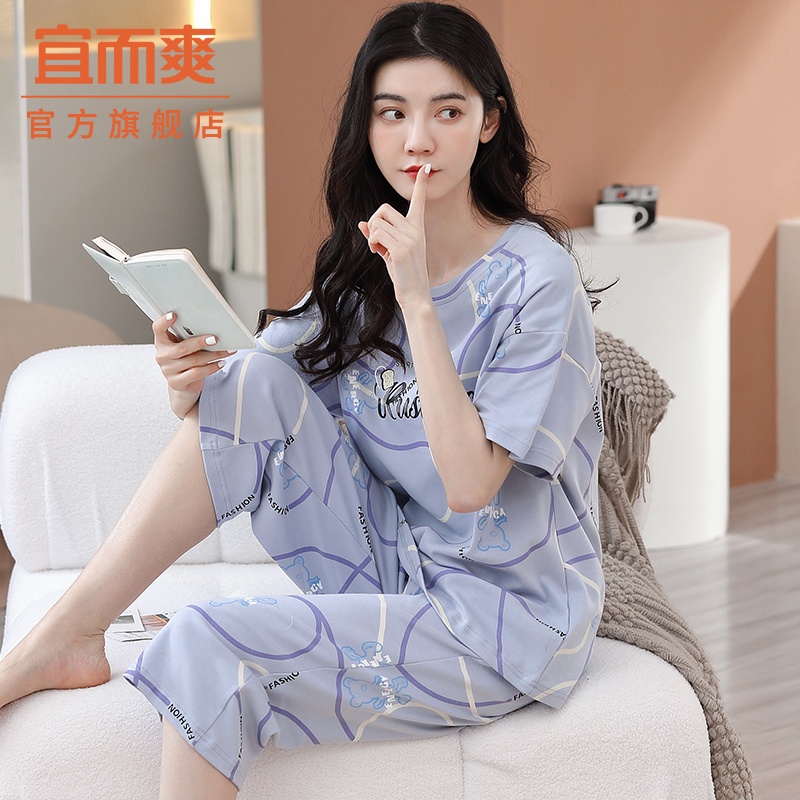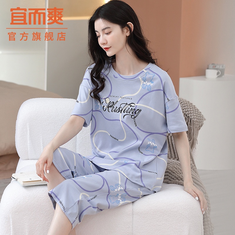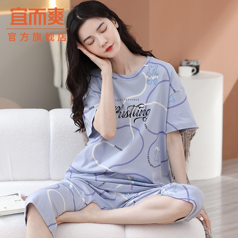 全棉宽松家居服套装 宜而爽新款 纯棉睡衣女夏天大码 七分裤 圆领短袖