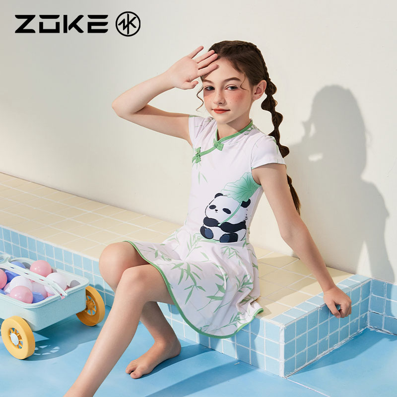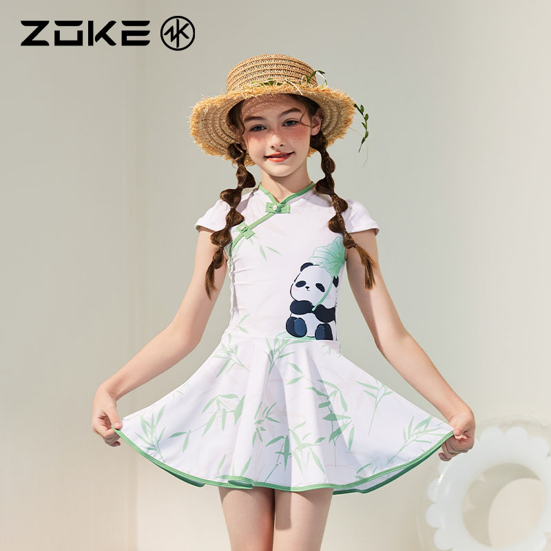 洲克儿童连体泳衣裙摆平角新中式 zoke熊猫女孩游泳训练防晒泳装