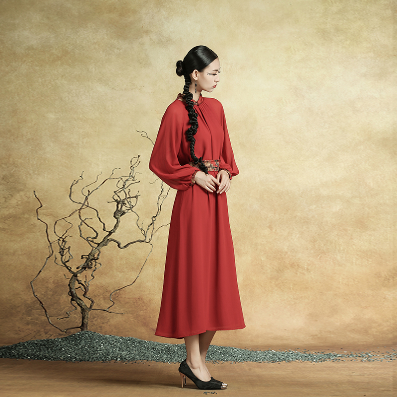 赫本风法式 太平鸟长袖 修身 中长款 船领收腰褶皱连衣裙女25春新款