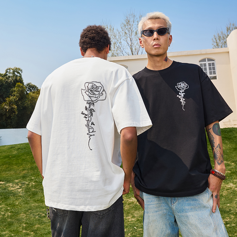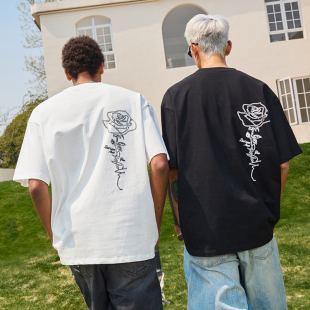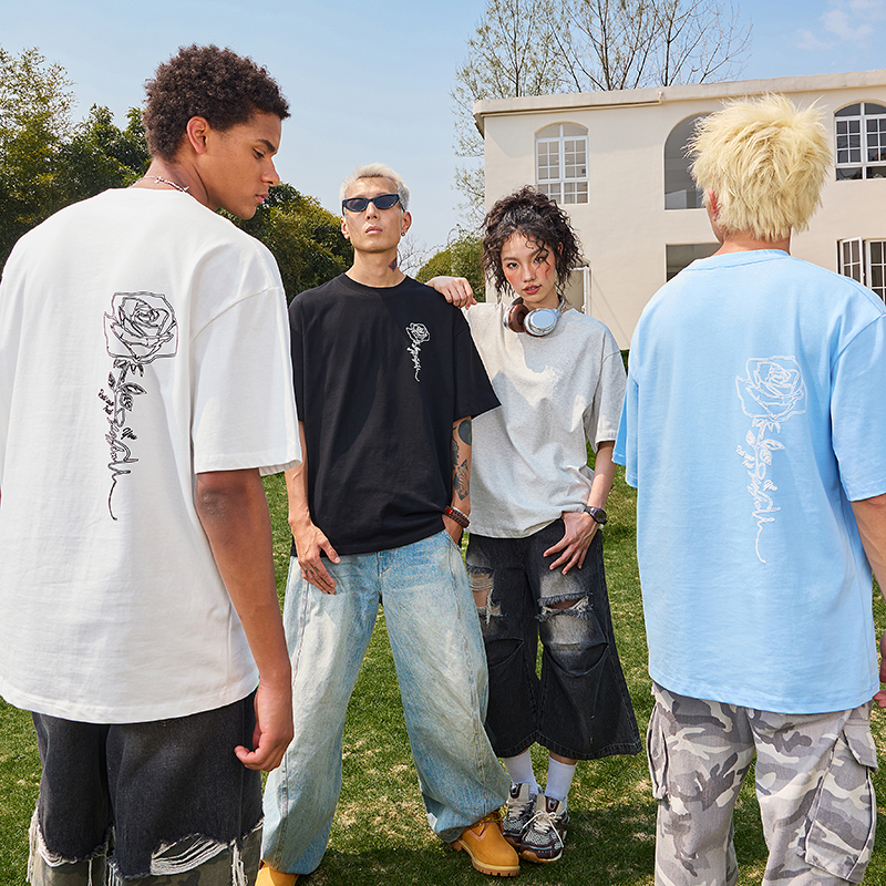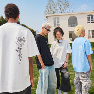 情侣男女2025新款 潮牌复古印花宽松半袖 T恤美式 Nuthink玫瑰花短袖