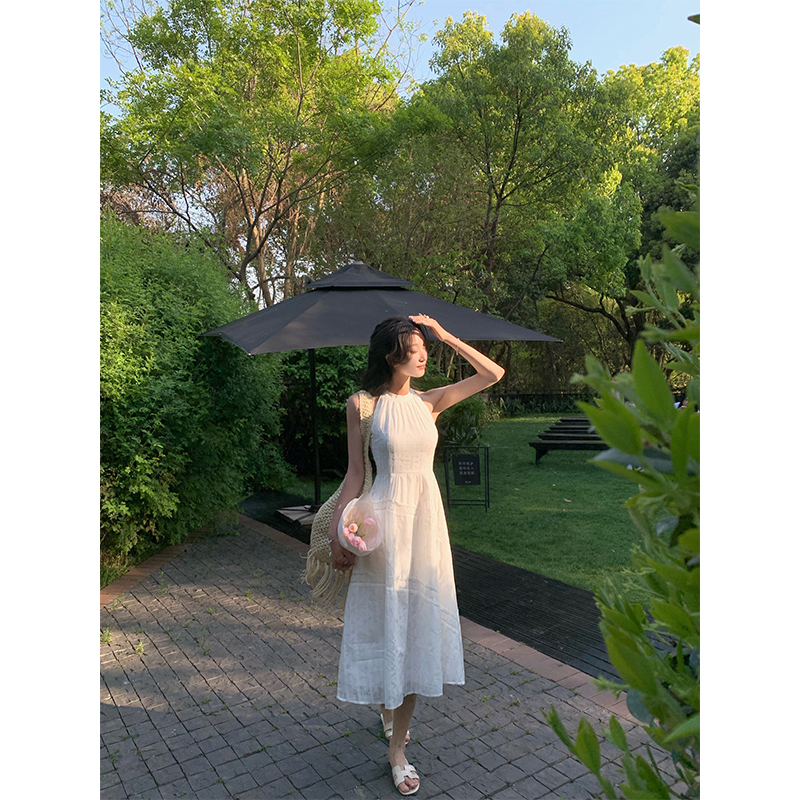 新款 韩语琳 挂脖露肩连衣裙女气质中长裙女秋季 白色无袖 2025 法式
