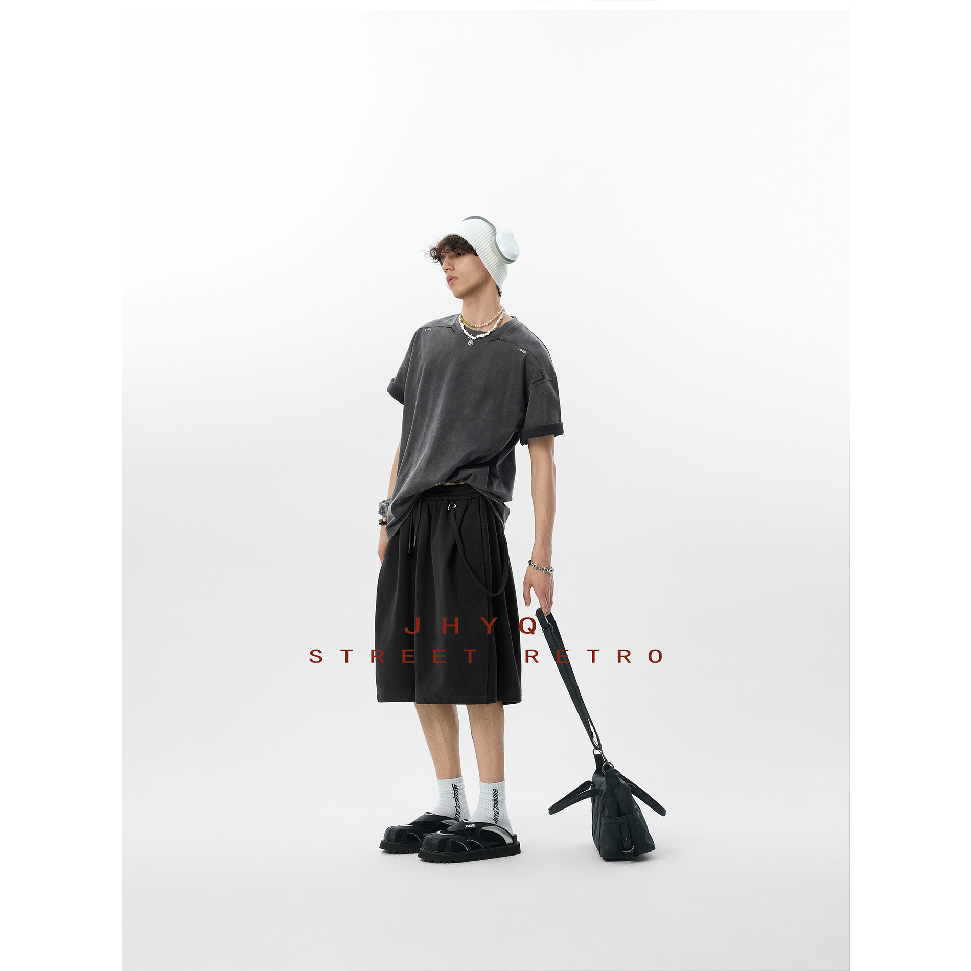 JHYQ美式 休闲重水洗做旧圆领T恤男宽松潮牌立体剪裁重磅百搭上衣