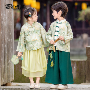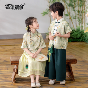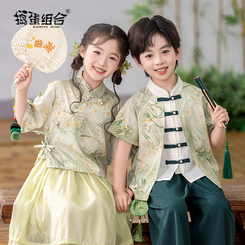 国风亲子唐装 中式 幼儿园民族演出服 女童古风古装 男童汉服夏秋短袖
