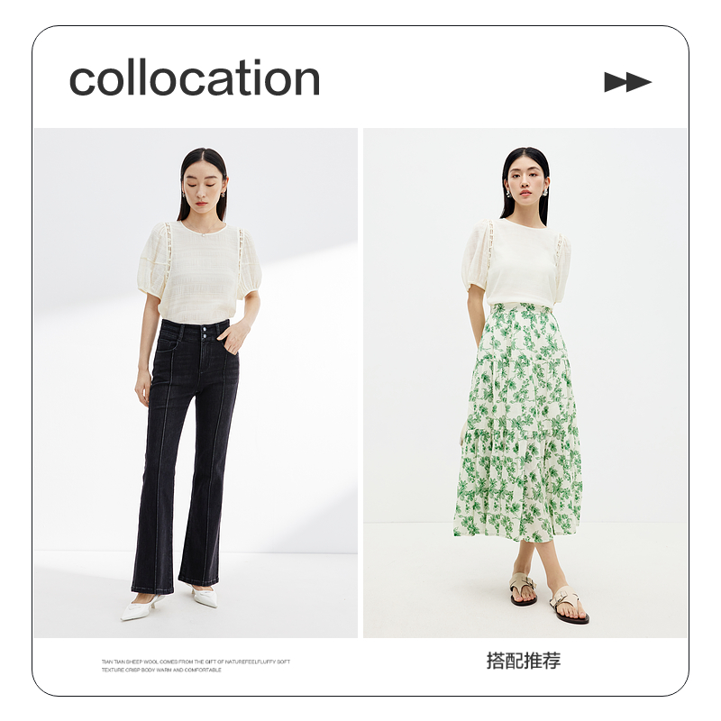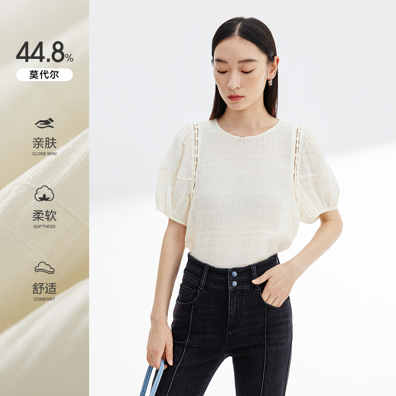 衬衫 设计师款 纯棉镂空串珠圆领短袖 女夏季 18345817 佐丹奴宽松衬衫