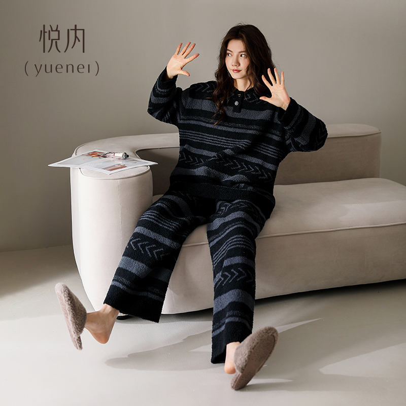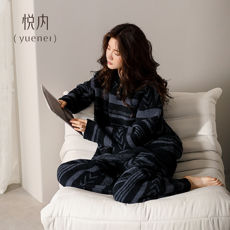 加厚珊瑚绒女士睡衣套装 秋冬加绒保暖法兰绒家居服两件套 简约长袖